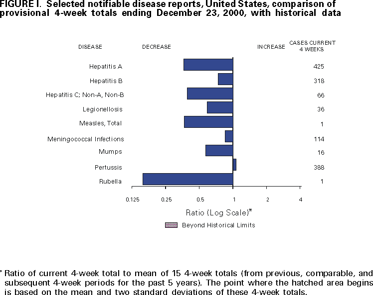 Figure I   Selected notifiable disease reports, United States, comparison of provisional 4-week totals ending December 23, 2000, with historical data