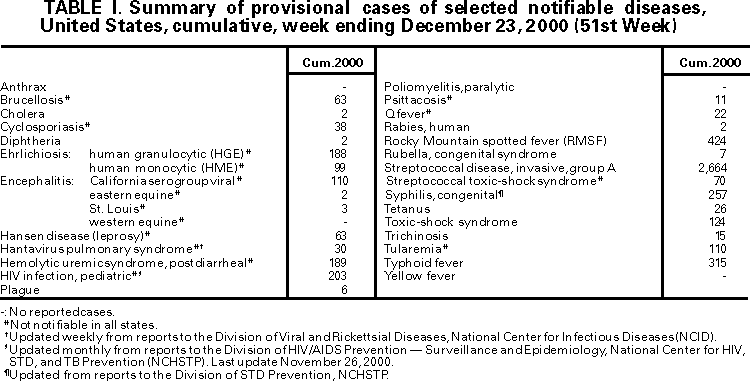Table I   Summary -- provisional cases of selected notifiable diseases, United States, cumulative, week ending December 23, 2000 (51st Week)