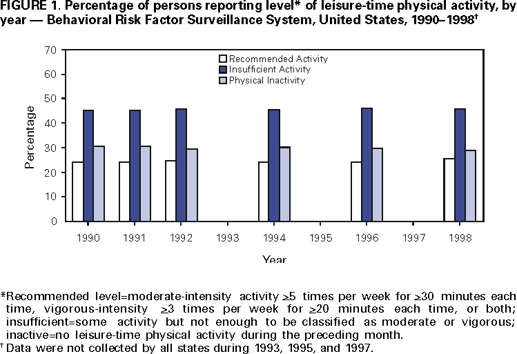 Persons using assistive technology might not be able to fully access information in this file. For assistance, please send e-mail to: mmwrq@cdc.gov. Type 508 Accommodation and the title of the report in the subject line of e-mail. Physical Activity Trends --- United States, 1990--1998Physical activity is associated with numerous health benefits (1), and increased participation in various types of leisure-time physical activity had been encouraged during the 1990s (2). To determine national estimates of leisure-time physical activity during 1990--1998, data were obtained from the Behavioral Risk Factor Surveillance System (BRFSS). This report summarizes the results of that analysis, which indicate that leisure-time physical activity trends have remained unchanged. BRFSS is a population-based, random-digit--dialed telephone survey of the civilian, noninstitutionalized U.S. population aged >18 years. Forty-three states and the District of Columbia collected data about physical activity for 1990, 1991, 1992, 1994, 1996, and 1998. Data were not collected by all states during 1993, 1995, and 1997. Respondents were asked about the two physical activities or exercises they engage in most often and about the frequency, duration, and distance (as appropriate) of each activity. Responses were then classified as one of 56 selected activities (Table 1). Moderate activity was defined as any of the 56 selected activities, and vigorous activity was defined as aerobic physical activity classified as vigorous-intensity based on estimated metabolic expenditure (MET) (Table 1). To classify an activity as vigorous, it must be aerobic with an assigned MET value (3) that is at least 60% of a person's maximal cardiorespiratory capacity (MCC). MET values are determined using two regression equations for MCC (4): one for men (METS 60%MCC = [0.6 x (60 - 0.55 x age)]/ 3.5) and one for women (METS 60%MCC = [0.6 x (48 - 0.37 x age)]/ 3.5). To have achieved recommended levels of physical activity, a person must have reported engaging in moderate-intensity physical activity >5 times per week for >30 minutes each time, vigorous-intensity physical activity >3 times per week for >20 minutes each time, or both during the preceding month. Persons reporting some activity during the preceding month but not enough to be classified as moderate or vigorous were classified as insufficient. Persons classified as inactive reported no physical activity outside of their occupation during the preceding month. Data were analyzed using SUDAAN to obtain prevalence estimates for recommended levels of physical activity. All data were age adjusted to the 2000 standard population. The prevalence of those who engaged in recommended levels of activity increased slightly from 24.3% in 1990 to 25.4% in 1998, and the prevalence of those reporting insufficient activity increased from 45.0% in 1990 to 45.9% in 1998 (Figure 1). Those reporting no physical activity decreased from 30.7% in 1990 to 28.7% in 1998. The components of recommended activity remained relatively stable (Figure 2). Reported by: Physical Activity and Health Br, Div of Nutrition and Physical Activity, and Cardiovascular Health Br, Div of Adult and Community Health, National Center for Chronic Disease Prevention and Health Promotion; and an EIS Officer, CDC. Editorial Note:The findings in this report indicate that trends in physical activity remained stable during 1990--1998. Classifying persons according to their main pair of nonoccupational activities during the preceding month suggests that only approximately one fourth of U.S. adults meet recommended levels of physical activity. During 1990--1998, the BRFSS formula for calculating vigorous intensity changed. In 1992, vigorous intensity was calculated as 50% of MCC; before 1992, it was calculated as 60% of MCC, the generally accepted threshold for vigorous activity. The data reported here vary from previous reports (1) because all years of data were calculated using the same formula for vigorous intensity (60% MCC). Therefore, the slight increase in vigorous physical activity that might have appeared after 1992 in previous reports was attributed to differences in calculating vigorous physical activity rather than an actual increase among the population. The findings in this report are subject to at least four limitations. First, these data are self-reported and are subject to recall bias. Second, because these data do not include information on nonleisure-time physical activities, total activity may be underestimated. Third, only the two most common activities the respondents engaged in during the preceding month are reported. Finally, these data are limited by coverage- and nonresponse-related errors. Moderate-intensity physical activity has substantial health benefits (1). Moderate-intensity activities include housework, childcare activities, occupational activity, or walking for transportation, which may be more prevalent among women and certain subgroups of the population. However, surveillance systems that primarily are based on sports-related vigorous activities may miss a substantial portion of this type of activity. Also, systems based on only two reported activities may miss less intense or moderate-intensity activities. Public health programs usually encourage participation in moderate-intensity rather than vigorous-intensity activities for sedentary persons. Surveillance systems should be updated so that a broader range of physical activities can be measured. A more extensive measurement system would enable determination of whether the trends in this report are an accurate reflection of physical activity trends in the United States. References