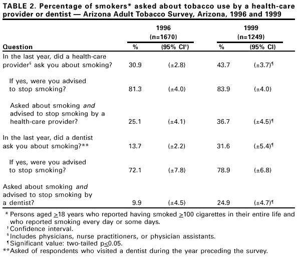 Persons using assistive technology might not be able to fully access information in this file. For assistance, please send e-mail to: mmwrq@cdc.gov. Type 508 Accommodation and the title of the report in the subject line of e-mail. Tobacco Use Among Adults --- Arizona, 1996 and 1999In 1994, Arizona passed the Tobacco Tax and Healthcare Act (Proposition 200) that increased the tax on cigarettes from $0.18 to $0.58, and allocated 23% of the resulting revenues to tobacco-control activities. Since 1995, Arizona has used the tobacco-control funds (approximately $30 million per year) to support the Arizona Department of Health Services (ADHS) Tobacco Education and Prevention Program (TEPP), a comprehensive program to prevent and reduce tobacco use. To track changes in tobacco use, the knowledge and opinions of Arizona residents about tobacco use, and the proportion of smokers advised to quit smoking by health-care providers, ADHS conducted the Arizona Adult Tobacco Survey (ATS) in 1996 and a follow-up survey in 1999. This report compares results of these two surveys, which indicate that prevalence of tobacco use among adults decreased, and the proportion of adults who were both asked about tobacco use and advised to quit by health-care providers and dentists increased. On the basis of these findings, if all states implemented comprehensive programs similar to those in Arizona, the national health objective for 2010 of reducing the adult smoking rate by half during this decade could be achieved. The Arizona ATS is a random-digit--dialed, computerized, telephone-interview survey of Arizona residents aged >18 years in five regions of the state. Surveys were conducted in English or Spanish. In 1996, 6000 surveys were completed, and in 1999, 4868 were completed. The response rate (1) was 83.4% for the 1996 survey and 74.6% for the 1999 survey. To ensure representativeness and comparability, the samples in 1996 and 1999 were standardized to the 1996 age/race distribution for Arizona. The data were weighted by the number of adults in the household and the proportion of the adult population in the regions sampled. The surveys were analyzed by using SAS for point estimates and SUDAAN for standard errors. Hypothesis tests for changes in point estimates of current smoking were conducted for each demographic category. Resulting two-tailed p-values of <0.05 were significant. A current smoker was defined as someone who answered "yes" to the question "Have you smoked at least 100 cigarettes in your entire life?" and who answered "every day" or "some days" to the question "Do you now smoke cigarettes every day, some days, or not at all?" Current smokers also were asked whether their health-care provider asked them about smoking and, if so, whether their health-care provider advised them to quit. Prevalence of current smoking declined among women, men, whites, and Hispanics (Table 1). The greatest decrease in smoking prevalence, by age, was among smokers aged >65 years. By income level, the most substantial decline in smoking prevalence was among those with a household income of <$10,000 per year. By education level, the greatest reduction in smoking was among persons with an 8th grade education or less. From 1996 to 1999, a significant increase was found in the percentage of smokers who were asked about smoking by health-care providers (i.e., physicians, nurse practitioners, physician assistants) and dentists (Table 2). Although no difference was found between 1996 and 1999 in the proportion of smokers advised to quit smoking (of those who were asked about smoking), the overall proportion of smokers both asked about smoking and advised to quit by a health-care provider (the product of the first two proportions) increased from 25.1% (95% confidence interval [CI]=±4.1) in 1996 to 36.7% (95% CI=±4.5) in 1999. The proportion of smokers who were both asked about smoking and advised to quit by a dentist increased from 9.9% (95% CI=±4.5) in 1996 to 24.9% (95% CI=±4.7) in 1999. Reported by: RS Porter, MS, VR Gowda, MHS, K Kotchou, MPH, J Nodora, DrPH, R Leischow, MPH, Arizona Dept of Health Svcs. Office on Smoking and Health, National Center for Chronic Disease Prevention and Health Promotion, CDC. Editorial Note:The results of the 1996 and 1999 Arizona ATS indicate that the prevalence of cigarette use among Arizona adults decreased substantially following the implementation of the statewide Arizona TEPP. The decrease in smoking prevalence among low income and low education groups also indicates a narrowing in disparities in cigarette use. TEPP directed many of its activities toward Hispanics, which may, in part, explain the substantial decrease in cigarette smoking in that population. TEPP serves the Hispanic population through its Spanish language statewide media campaign and telephone helpline and through local cessation and prevention services. TEPP uses methods appropriate for this population, including Promotoras de Salud (lay health workers) and culturally appropriate materials and curricula. The Arizona ATS results also showed a substantial increase in the proportion of smokers who reported that either a health-care provider or a dentist both asked about tobacco use and advised them to quit. Health-care providers can play a key role in assisting patients to quit smoking (2), and brief physician advice substantially increases successful quitting (2). TEPP, through statewide and local projects, provides training for health-care providers to increase the number of patients with whom they briefly discuss stopping smoking. The findings in this report are subject to at least five limitations. First, it is difficult to separate the effects of TEPP from price increases. The cigarette tax in Arizona increased from $0.18 to $0.58 per pack in November 1994, which may have contributed to the decline in adult smoking prevalence. Although the tax increase occurred more than a year before the first survey, the average re