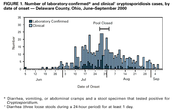 In July 2000, the Delaware City/County Health Department (DCCHD) learned of several laboratory-confirmed cases of cryptosporidiosis potentially linked to a private swim club. To determine associated exposures, DCCHD, in collaboration with the Ohio State Health Department and CDC, conducted an investigation.