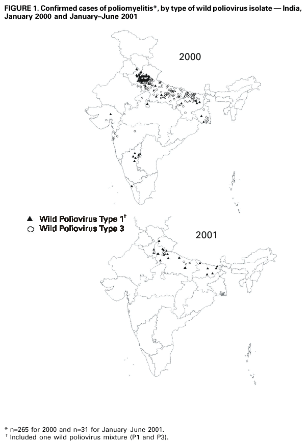 Of 265 virus-confirmed cases in India in 2000, 138 (52%) were poliovirus type 1 (P1), 126 (48%) were poliovirus type 3 (P3), and one case was a mixture of P1 and P3 (Figure 1). The last reported case of wild poliovirus type 2 in the world was isolated from an AFP case from India in October 1999 (Aligarh District, Uttar Pradesh). The number of polio cases reported from Bangladesh decreased from 393 (29 virus-confirmed) in 1999 to 197 (one virus-confirmed) in 2000. During that year, wild viruses also were isolated from two cases in Myanmar (along the border with Bangladesh) and from four cases in Nepal (along the border with India). By June 30, 2001, 31 virus-confirmed polio cases had been detected in the four northern states of Bihar, Delhi, Haryana, and Uttar Pradesh in India; and no virus had been found elsewhere in SEAR.