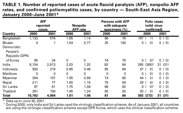 Since the World Health Assembly resolved in 1988 to eradicate poliomyelitis globally (1), the estimated number of polio cases worldwide has declined 99%. During 1994, member countries of the South-East Asia Region (SEAR)* of the World Health Organization (WHO) began accelerating efforts to eradicate polio. By 2000 (2), wild poliovirus was detected in only four of the 10 countries: Bangladesh, India, Nepal, and Myanmar. This report summarizes polio eradication activities during January 2000--June 2001 in SEAR, where wild poliovirus transmission has declined rapidly and is occurring primarily in northern India.