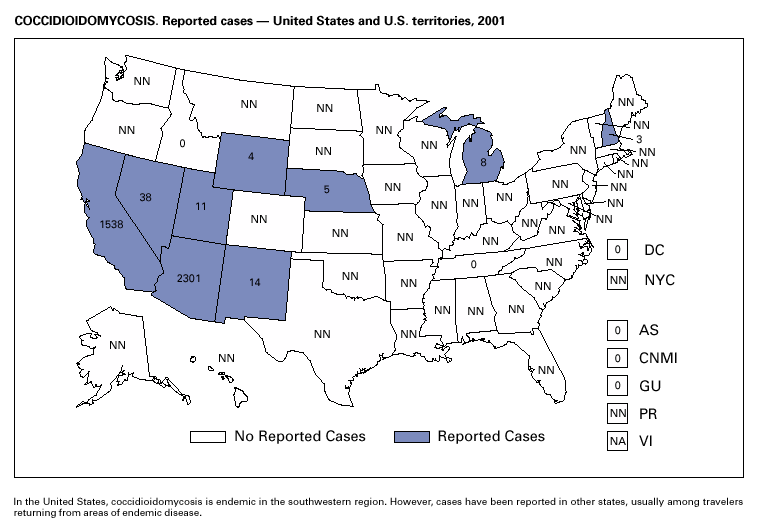 In September and October 2001, in an unprecedented biological terrorism event, letters containing Bacillus anthracis spores were sent through the U.S. Postal Service to various addresses in several states. Eleven inhalational and 11 cutaneous (four suspected and seven confirmed) anthrax cases resulted. Five of the 11 inhalational infections were fatal. These bioterrorism-associated cases occurred among residents of seven states along the East Coast of the United States: Connecticut, one case; Florida, two cases; Maryland, three cases; New Jersey, five cases; New York City, eight cases (includes a case in a New Jersey resident exposed in New York City); Pennsylvania, one case; and Virginia, two cases. In addition to the 22 bioterrorism-associated cases, one naturally occurring case of cutaneous anthrax (associated with direct exposure to livestock that had died of anthrax) was reported from Texas in the summer of 2001. B. anthracis remains a Category A bioterrorism threat agent.