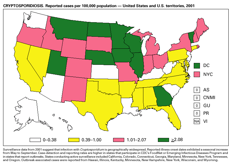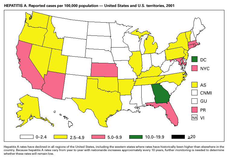 Population estimates for the states are from the April 1, 2000, population estimates from the Population Division, U.S. Bureau of the Census. Population numbers for territories are 2000 estimates from the U.S. Bureau of the Census, International Data Base Data Access Display Mode. More information regarding census estimates is available at http://eire.census.gov/popest/data/states/tables/ST-EST2002-01.php and http:// www.census.gov/ipc/www/idbprint.html. The choice of population denominators for incidence rates reported in the MMWR is based on 1) the consistency in the incidence rates reported by various CDC programs, and 2) the availability of census population data at the time of preparation for MMWR publications. Rates in the Summary are presented as incidence rates per 100,000 population, based on data for the U.S. total-resident population. However, population data from states in which diseases were not notifiable or disease data were not available were excluded from rate calculations.