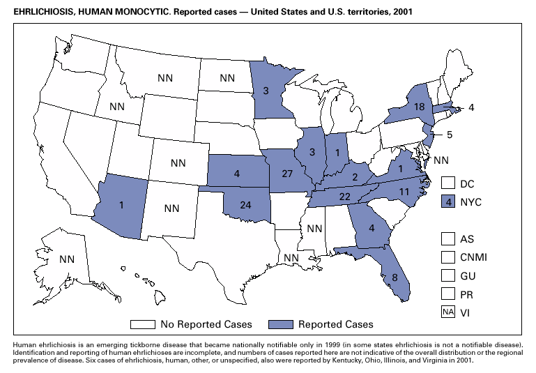 Part 1 contains tables showing incidence data for each of the diseases considered nationally notifiable during 2001.* The tables provide the number of cases of notifiable diseases reported to CDC for 2001, as well as the distribution of cases by month and geographic location and by patient’s age, sex, race, and Hispanic ethnicity. The data are final totals reported as of June 21, 2002, unless otherwise noted. Nationally notifiable diseases that are reportable in <40 states also do not appear in these tables. Ehrlichiosis, human, other or unspecified agent, is not reported in any tables because data are incomplete. In all tables, leprosy is listed as Hansen disease, and tickborne typhus fever is listed as Rocky Mountain spotted fever (RMSF). In addition, syphilis (all stages) includes the following categories: latent; early latent; late latent; latent of unknown duration; neurosyphilis; late, with clinical manifestations other than neurosyphilis; syphilitic stillbirth, and congenital syphilis. Part 2 contains graphs and maps that depict summary data for many of the notifiable diseases described in tabular form in Part 1. Part 3 contains tables that list the number of cases of notifiable diseases reported to CDC since 1970. This section also includes a table enumerating deaths associated with specified notifiable diseases reported to the National Center for Health Statistics (NCHS), CDC, during 1996–1999.†