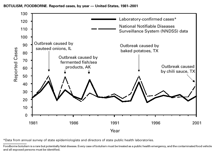 Thirty-nine cases of foodborne botulism were reported in 2001 through NNDSS. An outbreak of foodborne botulism in Texas involving nine culture-confirmed and seven clinically diagnosed cases was caused by commercially produced chili sauce and likely occurred because of time and temperature abuse of the food at a retail salvage store. The highest annual frequency of infant botulism, 97 cases, was reported in 2001. The number of wound botulism cases reported in 2001 was 19. Botulism surveillance conducted by the Foodborne and Diarrheal Diseases Branch, NCID, indicated 33 foodborne cases, 112 cases of infant botulism, and 23 cases of wound botulism. Clostridium botulinum toxin is a Category A bioterrorism threat agent.