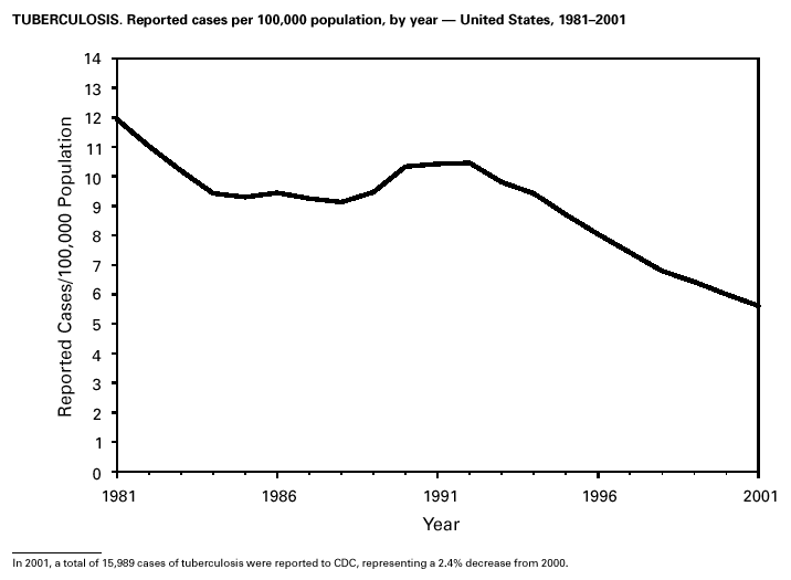 CDC. Reported tuberculosis in the United States, 2001. Atlanta, GA: US Department of Health and Human Services, CDC, September 2002. Available at http://www.cdc.gov/tb.
