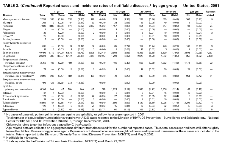 *Because no cases of paralytic poliomyelitis, western equine encephalitis, or yellow fever were reported in the United States during 2001, these diseases do not appear in the tables in Part 1.