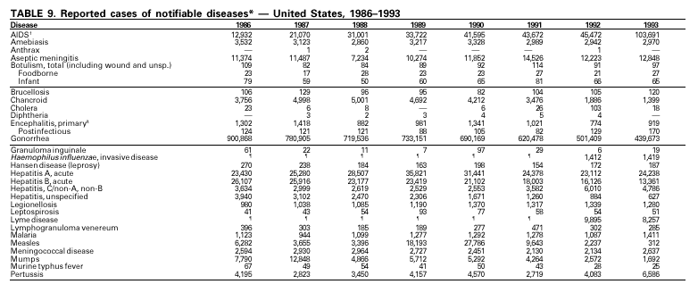 This section presents information on the public health importance of selected nationally notifiable diseases reported from the states to CDC, including a) domestic and some international disease outbreaks, b) active surveillance findings, c) changes in data reporting practices, d) the impact of prevention programs, e) the emergence of antimicrobial resistance, and f) changes in immunization policies. This information is intended to provide a context in which to interpret surveillance and disease-trend data and to provide further information on the epidemiology and prevention of selected diseases.