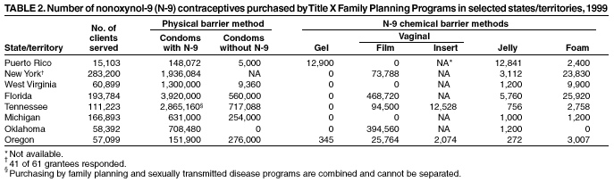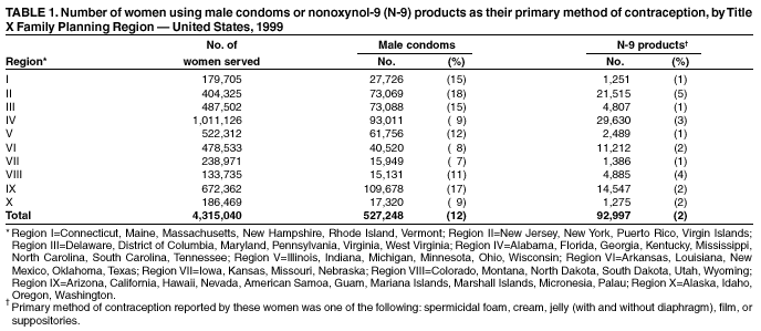 Persons using assistive technology might not be able to fully access information in this file. For assistance, please send e-mail to: mmwrq@cdc.gov. Type 508 Accommodation and the title of the report in the subject line of e-mail. Nonoxynol-9 Spermicide Contraception Use --- United States, 1999Most women in the United States with human immunodeficiency virus (HIV) become infected through sexual transmission, and a woman's choice of contraception can affect her risk for HIV transmission during sexual contact with an infected partner. Most contraceptives do not protect against transmission of HIV and other sexually transmitted diseases (STDs) (1), and the use of some contraceptives containing nonoxynol-9 (N-9) might increase the risk for HIV sexual transmission. Three randomized, controlled trials of the use of N-9 contraceptives by commercial sex workers (CSWs) in Africa failed to demonstrate any protection against HIV infection (2--4); one trial showed an increased risk (3). N-9 contraceptives also failed to protect against infection with Neisseria gonorrhoeae and Chlamydia trachomatis in two randomized trials (5,6), one among African CSWs and one among U.S. women recruited from an STD clinic. Because most women in the African studies had frequent sexual activity, had high-level exposure to N-9, and probably were exposed to a population of men with a high prevalence of HIV/STDs, the implications of these studies for U.S. women are uncertain. To determine the extent of N-9 contraceptive use among U.S. women, CDC assessed data provided by U.S. family planning clinics for 1999. This report summarizes the results of that assessment, which indicate that some U.S. women are using N-9 contraceptives. Sexually active women should consider their individual HIV/STD infection risk when choosing a method of contraception. Providers of family planning services should inform women at risk for HIV/STDs that N-9 contraceptives do not protect against these infections. CDC collected information on types of N-9 contraceptives purchased and family planning program (FPP) guidelines for N-9 contraceptive use. The national FPP, authorized by Title X of the Public Health Service Act, serves approximately 4.5 million predominantly low-income women each year. Program data for 1999 were obtained from all 10 U.S. Department of Health and Human Services (HHS) regions on the number of female clients and the number of female clients who reported use of N-9 contraceptives or condoms as their primary method of contraception. CDC obtained limited purchase data for 1999 for specific N-9 contraceptives and program guidelines from eight state/territorial FPPs within six HHS regions. State health departments, family planning grantees, and family planning councils were contacted to request assistance in collecting data on purchasing patterns of the 91 Title X grantees; of the 12 FPPs that responded, eight provided sufficient data for analysis. In 1999, a total of 7%--18% of women attending Title X clinics reported using condoms as their primary method of contraception. Data on the percentage of condoms lubricated with N-9 were not available. A total of 1%--5% of all women attending Title X clinics reported using N-9 contraceptives (other than condoms) as their primary method of contraception (Table 1). Among the eight FPPs that provided purchase data, most (87%) condoms were N-9--lubricated (Table 2). All eight FPPs purchased N-9 contraceptives (i.e., vaginal films and suppositories, jellies, creams, and foams) to be used either alone or in combination with diaphragms or other contraceptive products. Four of the eight clinics had protocols or program guidance stating that N-9--containing foam should be dispensed routinely with condoms; two additional programs reported that despite the absence of a clinic protocol, the practice was common. Data for the other two programs were not available. Reported by: The Alan Guttmacher Institute, New York, New York. Office of Population Affairs, U.S. Dept of Health and Human Services, Bethesda, Maryland. A Duerr, MD, C Beck-Sague, MD, Div Reproductive Health, National Center Chronic Disease and Public Health Promotion; Div of HIV and AIDS Prevention, National Center HIV/AIDS, STDs, and TB Prevention; B Carlton-Tohill, EIS Officer, CDC. Editorial Note:The findings in this report indicate that in 1999, before the release of recent publications on N-9 and HIV/STDs (4,6,7), Title X family planning clinics in the U.S. purchased and distributed N-9 contraceptives. Among at least eight family planning clinics, most of the condoms purchased were N-9--lubricated; this is consistent with trends in condom purchases among the general public (8). The 2002 STD treatment guidelines state that condoms lubricated with spermicides are no more effective than other lubricated condoms in protecting against the transmission of HIV infection and other STDs (7). CDC recommends that previously purchased condoms lubricated with N-9 spermicide continue to be distributed provided the condoms have not passed their expiration date. The amount of N-9 on a spermicide-lubricated condom is small relative to the doses tested in the studies in Africa and the use of N-9--lubricated condoms is preferable to using no condom at all. In the future, purchase of condoms lubricated with N-9 is not recommended because of their increased cost, shorter shelf life, association with urinary tract infections in young women, and lack of apparent benefit compared with other lubricated condoms (7). Spermicidal gel is used in conjunction with diaphragms (1); only diaphragms combined with the use of spermicide are approved as contraceptives. The respective contributions of the physical barrier (diaphragm) and chemical barrier (spermicide) are unknown, but the combined use prevents approximately 460,000 pregnancies in the United States each year (1). The findings in this report are subject to at least two limitations. First, data on specific pr