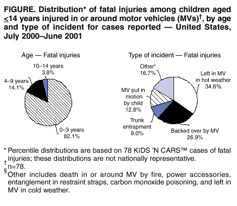 Persons using assistive technology might not be able to fully access information in this file. For assistance, please send e-mail to: mmwrq@cdc.gov. Type 508 Accommodation and the title of the report in the subject line of e-mail. Injuries and Deaths Among Children Left Unattended in or Around Motor Vehicles --- United States, July 2000--June 2001National attention concerning motor vehicles (MVs) and child safety has focused largely on protecting children as occupants transported in traffic on public roads. However, children who are unattended in or around MVs that are not in traffic also are at increased risk for injury and death. CDC and the nonprofit Trauma Foundation examined data from two databases on both nonfatal and fatal nontraffic MV-related incidents. This report summarizes the results of that analysis, highlights the major causes of this type of childhood death and injury, and underscores the need for effective interventions. Nationally representative data on nonfatal injuries treated in hospital emergency departments (EDs) from the National Electronic Injury Surveillance System All Injury Program (NEISS-AIP) were examined (1). Data on fatal injuries occurring across the country were reported from a database developed by the Trauma Foundation's KIDS 'N CARS program. During July 2000--June, 2001, data from these two programs documented an estimated 9,160 nonfatal injuries and 78 fatal injuries among children aged <14 years who were left unattended in or around MVs that were not in traffic. NEISS-AIP, which is operated by the U.S. Consumer Product Safety Commission, collects data annually on approximately 500,000 cases from a nationally representative sample of 65 hospital EDs in the United States. National estimates of nonfatal injuries treated in hospital EDs were calculated by using the sum of sample weights of study cases; weights were derived based on the inverse of the probability of selection; confidence intervals (CIs) were computed by using a direct variance estimation procedure (1). Population estimates for computing rates were obtained from the U.S. Bureau of Census. NEISS-AIP study case-patients were children treated in a U.S. hospital ED after being injured while left unattended in or around MVs (e.g., cars, trucks, vans, and SUVs) not in traffic. These nontraffic injuries included those associated with 1) parked MVs on or off the street and 2) MVs in motion off the street. Children injured during the normal course of getting in or out of stationary MVs were excluded. NEISS-AIP obtains data routinely for each nonfatal injury on the principal diagnosis, body part primarily affected, ED discharge disposition, and locale of occurrence (e.g., home or public place). Narratives describing each injury event were used to identify the surface where the incident occurred (e.g., driveway, parking lot, or street) and type of event. A classification scheme assigned cases to the following types of events: run over or backed over by an MV, struck by an MV, fell out of an MV in motion, or fell off of the exterior of an MV (e.g., the bed of a pick-up truck), and other specified (e.g., bumped against, dragged by, submerged in, or overheated in an MV). The KIDS 'N CARS database was used to describe specific incidents involving children aged <14 years who died as a result of being left unattended in or around MVs. National estimates of fatalities cannot be derived from this database. KIDS 'N CARS identifies cases through 1) online searches of LexisNexis, a service providing access to thousands of newspapers and magazines worldwide; 2) keyword searches on Internet search engines, the registration of keyword preferences with Internet providers and news media sites, and searches within archives of newspaper websites; 3) news accounts from a clipping service; 4) contacts with child death review teams; and 5) information from an informal nationwide network of professional and personal contacts. Documentation from news media archives and other record sources is used to validate all cases identified. A total of 192 NEISS-AIP study cases was identified, representing a national estimate of 9,160 (95% CI=5,344--12,976) children with nonfatal injuries treated in U.S. hospital EDs during July 2000--June 2001. Approximately 42% of injured children were aged <4 years, and 61.9% were male (Table 1). Injuries occurred predominantly to the head and neck region (30.4%) and the extremities (53.1%). Most (56.8%) injuries were minor contusions and abrasions; however, more serious injuries also were common (26.5% were fractures or internal injuries). Most (81.8%) injured children were treated and released from the ED. Most injuries occurred near the home (47.8%) or on public property (31.1%). Injuries occurred in driveways and parking lots in at least 27.2% of incidents (Table 2). The most common type of nonfatal incident was being struck by an MV, followed by being run over or backed over by an MV and falling out or off of an MV. For nonfatal incidents, approximately 70% of MVs were moving at a slow speed (e.g., moving forward or backward shortly after being set in motion), and approximately 20% were moving backward. The KIDS 'N CARS database provided information on 78 children who died during July 2000--June 2001 in 76 separate incidents. Fatalities occurred in 28 states and the District of Columbia. Of the fatally injured children, 64 (82.1%) were aged <4 years, and 42 (53.8%) were male. In 57 (73.1%) cases, the MV was located near a home (e.g., driveway, unpaved area near home, or street in front of home); in 39 (50%) cases, the child lived at that home. The driver was the parent in 12 (57.1%) of the 21 cases in which a child was backed over. The most common type of fatal incident was exposure to excessive heat inside an MV (e.g., when a child was left inside an MV during hot weather) (34.6%), followed by being backed over and being hurt when a child put an MV in motion (26.9%). Approximately 82% of fa