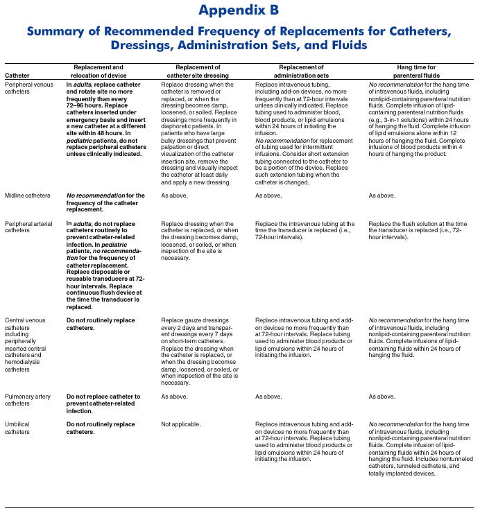 In the MMWR Recommendations and Reports, "Guidelines for the Prevention of Intravascular Catheter-Related Infections," published on August 9, 2002, on page 29 in Appendix B, an error occurred under the column heading "Replacement and relocation of device." The corrected table is as follows: