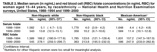 Persons using assistive technology might not be able to fully access information in this file. For assistance, please send e-mail to: mmwrq@cdc.gov. Type 508 Accommodation and the title of the report in the subject line of e-mail. Folate Status in Women of Childbearing Age, by Race/Ethnicity --- United States, 1999--2000In September 1992, the U.S. Public Health Service (PHS) recommended that women of childbearing age (i.e., aged 15--44 years) who are capable of becoming pregnant should consume 400 µg of the B-vitamin folic acid to reduce the number of cases of spina bifida and anencephaly (neural tube defects [NTDs]) (1). Since then, an ongoing national effort has encouraged women to consume dietary supplements containing folic acid (2). In 1998, the Food and Drug Administration (FDA) required the fortification of enriched cereal grain products with folic acid (3), and manufacturers have voluntarily added more folic acid to many ready-to-eat breakfast cereals (CDC, unpublished data, 2002). To assess temporal changes in serum and red blood cell (RBC) folate concentrations among childbearing-aged women, CDC compared folate concentrations for childbearing-aged women who participated during 1988--1994 and 1999--2000 in the National Health and Nutrition Examination Survey (NHANES). This report outlines the results of this comparison and describes serum and RBC folate levels by race/ethnicity. The results indicate that over the period studied, the median serum folate concentration for women aged 15--44 years increased approximately threefold, and the median RBC folate concentration increased approximately twofold. These findings indicate that the national health objective for 2010 to increase the median RBC folate level among women of childbearing age to 220 ng/mL RBC (objective 16.16b) has been met for Mexican-American* and non-Hispanic white women but not for non-Hispanic black women. To reduce the number of pregnancies affected by NTDs further, all women of childbearing age capable of becoming pregnant should consume the PHS-recommended level of folic acid daily (1). Both NHANES 1988--1994 and NHANES 1999--2000 used a stratified, multistage probability sample of the civilian, U.S. noninstitutionalized population. NHANES 1988--1994 included persons aged >2 months, and NHANES 1999--2000 included persons of all ages. A household interview and a physical examination were conducted for each survey participant. During the physical examination, blood was collected by venipuncture for all persons aged >1 year. Serum and RBC folate were measured in CDC's NHANES Central Laboratory for both NHANES 1988--1994 and NHANES 1999--2000 by using the Bio-Rad Quantaphase II simultaneous folate/vitamin B12 radioassay (Bio-Rad Laboratories, Hercules, California) (4). Long-term quality-control data for these assays, including overlapping control materials that were used in both surveys, indicated no analytical drift; results of all external proficiency testing challenges were graded as satisfactory. From NHANES 1988--1994 to NHANES 1999--2000, median serum folate concentrations for women aged 15--44 years increased from 4.8 to 13.0 ng/mL. The 10th percentile increased from 2.3 to 6.4 ng/mL, and the 75th percentile increased from 7.8 to 18.1 ng/mL (Table 1). Serum folate concentrations increased for each of the three racial/ethnic populations for which estimates could be made (Table 2); in NHANES 1999--2000, the median serum folate concentration was highest for non-Hispanic whites (13.8 ng/mL) and lowest for non-Hispanic blacks (10.2 ng/mL). Similar results were obtained for RBC folate, a better measure of long-term folate status. Median RBC folate concentrations for women aged 15--44 years increased from 159.9 to 263.6 ng/mL RBC (Table 1). RBC folate concentrations increased for all racial/ethnic groups studied (Table 2). In NHANES 1999--2000, the highest RBC folate concentrations occurred among non-Hispanic white women (median: 278.1 ng/mL RBC) and were lowest among non-Hispanic black women (median: 213.8 ng/mL RBC). Reported by: JD Erickson, DDS, J Mulinare, MD, Q Yang, PhD, National Center on Birth Defects and Developmental Disabilities; CL Johnson, MSPH, National Center for Health Statistics; C Pfeiffer, PhD, EW Gunter, National Center for Environmental Health; WH Giles, MD, BA Bowman, PhD, National Center for Chronic Disease and Health Promotion, CDC. Editorial Note:Results from NHANES 1999--2000, which was conducted after implementation of food fortification and educational efforts to increase folate consumption, indicate that these public health actions have been effective in increasing folate status among U.S. women of childbearing age. The findings are consistent with reports of improved folate status in selected subsets of the U.S. population (5,6) and the results from the 1999 sample of NHANES 1999--2000 (7). In 1999, the median serum folate concentration was 14.5 ng/mL, and the median RBC folate concentration was 293 ng/mL RBC, somewhat higher than the 1999--2000 results. Both serum and RBC folate concentrations for the 2000 sample of NHANES 1999--2000 were lower than the 1999 sample. Annual variations in estimates from NHANES can be expected because of the size of the yearly sample and the nature of the sampling design, and these differences might be explained by sampling variability. Other possible explanations include reduced consumption of foods and supplements containing folic acid, a decrease in the folic acid content of fortified foods (8), or undetected variations in laboratory technique. Because of the high level of long-term assay quality-control, changes in laboratory technique probably do not account for the lower folate concentrations in 2000. Another line of evidence suggesting that variations in laboratory technique are not likely to explain the lower folate concentrations in 2000 is that vitamin B12 concentrations in women of childbearing age did not change from NHANES 1988--1994 to N