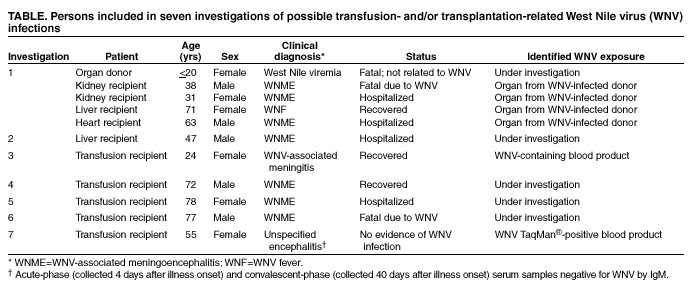 Investigation 1. On August 1, four organs were recovered from an organ donor and were transplanted into four persons (1,2). WNME was confirmed in three recipients and WNV fever in one recipient (Table). Illness began 7--17 days after transplantation. Although a sample of the donor's plasma collected at the time of the organ recovery was positive for WNV by kinetic quantitative PCR assay (TaqMan®), the source of the organ donor's infection is unknown. During treatment for injuries, which eventually were fatal, the organ donor received blood products from 63 unique donors. Donor follow-up has been initiated by the blood collection agency. Of 41 donors for whom retention segments* were available, 22 tested negative for WNV by TaqMan® and serology, and 19 tested negative for WNV by TaqMan®; serology testing on these 19 segments is in progress. In addition to the organ donor, 35 other persons received components derived from these 63 donors; follow-up of these recipients is pending. Untransfused components are being returned to the blood collection agency. One has tested negative for WNV by TaqMan®; testing on the others is under way.