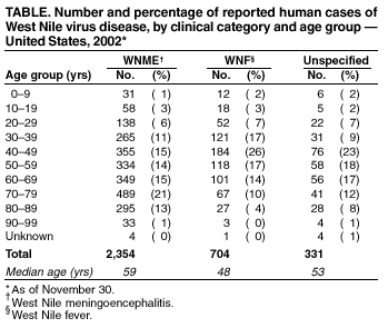 Persons using assistive technology might not be able to fully access information in this file. For assistance, please send e-mail to: mmwrq@cdc.gov. Type 508 Accommodation and the title of the report in the subject line of e-mail. Provisional Surveillance Summary of the West Nile Virus Epidemic --- United States, January--November 2002This report presents provisional summary surveillance data about West Nile virus (WNV) activity that were reported to CDC during January 1--November 30, 2002, through the ArboNET surveillance network. In 2002, the reported numbers of human and animal infections increased, and the geographic range of WNV activity expanded substantially. These data underscore the need for intensive surveillance to detect and quantify WNV activity in areas where humans are at risk, public education to teach persons how to prevent mosquito bites, and sustained and integrated mosquito-control activities. ArboNET is a web-based surveillance data network comprising 54 state and local public health departments and CDC. Specimens from ill humans and animals, dead birds, captive sentinel animals (mostly chickens), wild-caught birds, and mosquitoes were collected by state and local public health departments and other cooperating state and federal agencies and tested for WNV or WNV-specific antibody. Test results, the county and date of specimen collection or illness onset, and other data were entered into state and local public health department databases. Animal data were forwarded regularly to ArboNET through a secure data network; human cases were reported to CDC by telephone or facsimile only. In 2002, WNV activity was reported from 2,289 counties in 44 states and the District of Columbia (DC) (Figure 1) compared with 359 counties in 27 states and DC in 2001 (1), and WNV virus was detected for the first time in 1,929 U.S. counties and 16 states. In 2002, a total of 3,389 human cases* of WNV disease were reported, compared with 149 during 1999--2001, and large numbers of WNV-infected birds, equines, and mosquitoes also were reported. Human SurveillanceIn 2002, of the 3,389 reported cases of human WNV-associated illness, 2,354 (69%) persons had West Nile meningoencephalitis (WNME), 704 (21%) had West Nile fever (WNF), and 331 (10%) had an unspecified illness. Human cases were reported from 619 counties in 37 states and DC; five states (Illinois [774 cases], Michigan [475], Ohio [409], Louisiana [319], and Indiana [202]) accounted for 2,179 (64%) cases. Four of these five states (Illinois [492], Michigan [437], Ohio [277], and Louisiana [202]) together with Texas [164] accounted for 1,572 (67%) reported WNME cases. Illness onset dates ranged from June 10 to November 4 (Figure 2), and the epidemic peak of WNME cases occurred during the week ending August 24. Illness onset dates ranged from June 10 to November 4 in southern states and from July 10 to October 28 in northern§ states. The epidemic peak of WNME cases occurred 1 week earlier in southern states (88 cases during the week ending August 17) than in northern states (317 cases during the week ending August 24). For all reported human cases, the median age of infected persons was 55 years (range: 1 month--99 years); for persons with WNME, the median age was 59 years (range: 1 month--99 years); and for persons with WNF, the median age was 48 years (range: 1--93 years) (Table). Of the 2,354 persons with WNME, 199 (9%) died; two (0.3%) of 704 persons with WNF died; both were age >80 years. The median age of the 201 decedents was 78 years (range: 24--99 years). Animal SurveillanceOf 2,289 counties reporting WNV activity, 1,719 (75%) counties in 42 states and DC reported 14,122 dead WNV-infected birds (7,719 crows, 4,948 blue jays, and 1,455 birds of 92 other species). Infected birds were collected from January 10 to November 7, and the peak number of infected birds occurred during the week ending August 10. Of 10,036 tested dead crows, 7,719 (77%) were WNV-positive compared with 6,403 (40%) of 16,132 birds from other species. In 2002, a total of 9,144 (99.9%) of 9,157 reported nonhuman mammal cases occurred in equines, and 13 occurred in other species (dogs [three], squirrels [eight], and unspecified species [two]). Cases were reported from 1,374 counties in 38 states, with illness onset dates ranging from January 3 to November 8. Six states (Illinois [1,116 cases], Texas [1,050], Minnesota [945], Indiana [704], Kansas [675], and South Dakota [653]) accounted for 56% of reported nonhuman mammal cases. A limited number of counties and states tested mosquitoes (639 counties in 37 states and DC), wild-caught birds (65 counties in eight states), and sentinel chickens (92 counties in eight states) as part of WNV surveillance. In 2002, approximately 1.3 million mosquitoes of 88 species were tested. WNV was detected in 4,943 pools (representing 26 species) from 315 counties in 28 states and DC. Culex mosquitoes (Cx. pipiens, Cx. restuans, Cx. salinarius, Cx. quinquefasciatus, and Cx. tarsalis) accounted for 2,717 (55%) WNV-positive pools. WNV was reported for the first time in seven mosquito species (Aedes aegypti, Anopheles walkeri, Cx. erraticus, Cx. tarsalis, Cx. territans, Culiseta inornata, and Psorophora ciliata). Since 1999, a total of 36 WNV-infected mosquito species have been reported to ArboNET. In 2002, a total of 144 seropositive wild-caught birds were reported from 25 counties in four states (Indiana, Kansas, Louisiana, and Ohio), and 366 seroconverting captive sentinel birds were reported from 47 counties in seven states (Florida, Iowa, Nebraska, New York, North Carolina, Pennsylvania, and Texas). First Indicators of WNV ActivityAmong 2,289 counties reporting WNV activity in 2002, the first indicator of activity was a WNV-infected dead bird in 1,420 (62%) counties, an equine case in 660 (29%) counties, a human case in 84 (4%) counties, a seroconverting sentinel bird in 18 (0.8%) counties, an infected mosquito pool in 77 (3%) c
