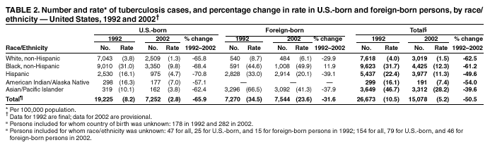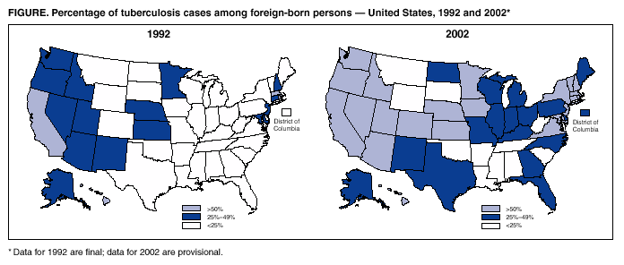 Persons using assistive technology might not be able to fully access information in this file. For assistance, please send e-mail to: mmwrq@cdc.gov. Type 508 Accommodation and the title of the report in the subject line of e-mail. Trends in Tuberculosis Morbidity --- United States, 1992--2002During 2002, a total of 15,078 TB cases were reported to CDC, representing a 5.7% decline from 2001, a 43.5% decline from the 1992 peak of the TB resurgence, and the lowest recorded TB rate in the United States since reporting began in 1953. Declines have occurred since 1992 in all age groups, racial/ethnic populations, and regions of the United States. Despite this progress, the 2002 rate of 5.2 per 100,000 population remained higher than the 2000 interim goal of 3.5 set as part of the national strategic plan for TB elimination (<1 case per 1,000,000 by 2010) (1). This report summarizes data from the national TB surveillance system for 2002 and describes trends over the past decade. Overall national declines in TB incidence mask substantial disparities between rates in the majority of U.S. residents and rates in the two populations, foreign-born persons and U.S.-born non-Hispanic blacks, which now account for approximately three fourths of TB cases. Further progress toward TB elimination in the United States will depend on 1) domestic programs that provide services to foreign-born persons with latent TB infection, 2) collaborative efforts that reduce the burden of TB disease globally, and 3) intensified TB-control efforts that address higher TB rates in the U.S.-born non-Hispanic black population. The 50 states and the District of Columbia report to the national TB surveillance system by using a standard case definition and report form (2). Completeness of reporting to the national system is estimated to be >95% (3). Data were analyzed for cases reported during 1992--2002 by using case reports updated as of February 18, 2003. A U.S.-born person was defined as someone born in the United States or its associated jurisdictions, or someone born in a foreign country but having at least one U.S.-born parent; others were classified as foreign-born. U.S.-born and foreign-born population counts in 1992 were obtained from postcensus estimates (4). Overall U.S.-born and foreign-born population counts for 2002 were based on an extrapolation from the April 2000 U.S. Census, and the distribution of racial/ethnic groups was estimated from the March 2000 Current Population Survey (5). In 2002, the overall TB case rate of 5.2 represents a decline of 7.1% from 2001 and 50.5% from 1992. During 1992--2002, case rates declined in all but three states (Table 1). Five states (California, Florida, Illinois, New York, and Texas) accounted for 52.5% of cases and 68.3% of the overall decrease in the number of cases; case rates in these states declined an average of approximately 50% during 1992--2002. The proportion of patients with multidrug-resistant TB (i.e., resistance to at least isoniazid and rifampin) decreased from 486 (2.7%) of 17,690 culture-positive cases with initial susceptibility results in 1993 (the first year for which data were collected) to 138 (1.3%) of 10,601 cases in 2002. During 1992--2002, rates declined in both the U.S.-born and the foreign-born populations. However, the decline was substantially less among foreign-born populations (Table 2), and the ratio of foreign-born to U.S.-born rates doubled, from 4.2 in 1992 to 8.4 in 2002. In 2002, for the first time, TB cases among foreign-born persons accounted for the majority (51.0%) of TB cases in the United States. The number of states with >50% of cases among foreign-born persons increased from four in 1992 to 22 in 2002 (Figure). In seven states, approximately 70% of cases were among foreign-born persons (New Hampshire [79.0%], Idaho [76.9%], Minnesota [76.4%], California [75.8%], Massachusetts [75.7%], Hawaii [74.3%], and Colorado [70.2%]. As in 1992, the most common birth countries for foreign-born persons with TB in 2002 were Mexico (24.8%), the Philippines (11.3%), Vietnam (8.6%), India (7.6%), China (4.5%), Haiti (3.4%), and South Korea (2.7%). The proportion of patients who completed recommended treatment within 1 year was 81.0% in the U.S.-born and 79.2% in the foreign-born populations in 1999 (the most recent year for which these outcome data were available). Despite a 68.4% decline in rates from 1992, U.S.-born non-Hispanic blacks in 2002 continued to have the highest TB rate of any U.S.-born racial/ethnic population. U.S.-born non-Hispanic blacks comprised the largest number of TB cases among both U.S.-born and foreign-born populations, representing 46.7% of TB cases in U.S.-born persons and approximately one fourth of all cases. Among U.S.-born racial/ethnic populations, rates among non-Hispanic blacks were 7.5 times higher and 2.1 times higher, respectively, than those among non-Hispanic whites and Hispanics, the two other U.S.-born groups that account for the majority of TB cases (Table 2). Reported by: Div of Tuberculosis Elimination, National Center for HIV, STD, and TB Prevention, CDC. Editorial Note:Since 1992, when TB cases in the United States peaked after 7 years of stable or increasing rates, TB case rates have declined an average of 5% per year. The strengthened TB control efforts that have been effective in reversing increases in TB rates among U.S.-born persons have had far less effect on TB rates among foreign-born persons (6). The reasons for these differences are unclear and require further study. The differences are not related to timeliness of completion of therapy, which is similar among U.S.-born and foreign-born persons. However, the accelerated decline in overall U.S. TB cases probably resulted from the implementation of control measures that reduced ongoing transmission of Mycobacterium tuberculosis and the subsequent number of TB cases caused by recent infection (7). These measures are relatively less effective in con