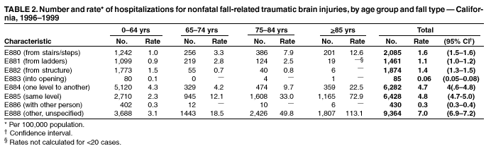 Persons using assistive technology might not be able to fully access information in this file. For assistance, please send e-mail to: mmwrq@cdc.gov. Type 508 Accommodation and the title of the report in the subject line of e-mail. Public Health and Aging: Nonfatal Fall-Related Traumatic Brain Injury Among Older Adults --- California, 1996--1999In the United States, falls are the second leading cause of traumatic brain injury (TBI) hospitalizations overall and the leading cause of TBI hospitalizations among persons aged >65 years (1). In 1995, TBIs resulted in an estimated $56 billion in direct and indirect costs in the United States (2). In California, during 1999, a total of 61,475 hospitalizations from falls were reported among persons aged >65 years (3). Risk factors for falling among older persons included arthritis; impairments in balance, gait, vision, and muscle strength; and the use of four or more prescription medications (2,4). As part of CDC's program of state-based TBI surveillance, California hospital discharge data were collected and analyzed to describe fall-related TBIs. This report summarizes the results of that analysis, which support previous findings that persons aged >65 years are at risk for hospitalization for a fall and that same-level falls are far more common among persons aged >65 years than falls from a higher level (e.g., a ladder, chair, or stair) (1,2,5). Defining the circumstances of fall injuries and recognizing the type of fall leading to TBI hospitalizations among older persons can help health-care providers conduct risk assessment and management of falls in this population. All nonfederal, acute care hospitals in California are required to report hospital discharges to the Office of Statewide Health Planning and Development. All first admissions with an injury diagnosis must be coded for external cause of injury (E-code); E-codes are listed in >99% of these records (5). For this report, cases were limited to first admissions. Hospitalization records of transfers, fatal cases, and out-of-state residents were excluded by matching sex, date of birth, and a record linkage number (i.e, an encrypted social security number). Hospital discharge records were coded according to the International Classification of Diseases, Ninth Revision, Clinical Modification (ICD-9-CM) (6). TBI cases were defined by the most recent CDC surveillance definition, in which any of the 25 diagnoses include one of the following nature-of-injury diagnosis codes: 800.0--801.9 (fracture of the vault of the skull), 803.0--804.9 (other and unqualified skull fracture), 850.0--854.1 (intracranial injury including concussion, laceration, and hemorrhage), or 959.01 (head injury, unspecified). The primary cause of injury for falls (E880--E886, E888) was analyzed by mechanism.* Age was categorized into one younger comparison group (aged 0--64 years) and three older groups (aged 65--74 years, 75--84 years, and >85 years). Incidence rates were calculated per 100,000 population by using mid-year population estimates of California residents for each year (Epidemiology and Prevention for Injury Control, California Department of Health Services, unpublished data, 1996--1999). During 1996--1999, a total of 29,761 fall-related TBI hospitalizations were reported; of these, 28,009 (94%) patients were discharged, and 1,752 were deceased. A total of 1,252 (71%) of fatal fall-related TBI hospitalizations were among those aged >65 years. Overall, the nonfatal fall-related TBI hospitalization rate was 21.1 per 100,000 population (95% confidence interval = 20.8--21.3) (Table 1). Hospitalization rates increased with age; the highest rate (223.0) was among persons aged >85 years. Compared with persons aged 0--64 years, the rate ratio of hospitalizations was 3.1 for persons aged 65--74 years, 7.6 for those aged 75--84 years, and 16.4 for those aged >85 years. Overall, males were hospitalized more frequently (59%) than females. Although 70% of hospitalizations among those aged <65 years were among males, females accounted for 56% of hospitalizations among those aged >65 years. For those aged >65 years, whites represented 78% of hospitalizations and had the highest rate (25.4) among all racial/ethnic populations. In 9,364 (33%) hospitalizations, the type of fall was coded "other and unspecified" (E888). Among the 18,645 specified falls, the pattern differed by age group (Table 2). Among persons aged 0--64 years, 75% of falls were from at least one level. Among persons aged >65 years, 60% of falls were on the same level. For the three older population groups, the proportion of specified falls on the same level also varied: 52% among persons aged 65--74 years, 61% among those aged 75--84 years, and 66% among those aged >85 years. By race/ethnicity for all age groups, the proportion of specified falls on the same level was 40% for whites, 31% for blacks, 23% for Hispanics, 36% for Asians/Pacific Islanders, and 33% for American Indians/Alaska Natives. Among persons aged 0--64 years, 13,792 (86%) were discharged with only self-care or unskilled care provided. The remainder were sent to another facility or discharged with in-home health services or outpatient rehabilitation. Among persons aged >65 years, the number discharged was 4,927 (41%). The proportion of persons discharged home decreased with increasing age. For those aged >85 years, the number discharged was 1,071 (30%) compared with 2,083 (41%) for those aged 75--84 years and 1,773 (54%) for those aged 65--74 years. Reported by: J Cross, PhD, R Trent, PhD, Epidemiology and Prevention for Injury Control, California Dept of Health Svcs. N Adekoya, DrPH, Div of Surveillance Systems and Informatics, Epidemiology Program Office, CDC. Editorial Note:In California, fall-related TBIs have a substantial impact on the health-care delivery system. Among those aged >85 years, three out of five hospitalizations resulted in a discharge to a residential facility with skilled nu