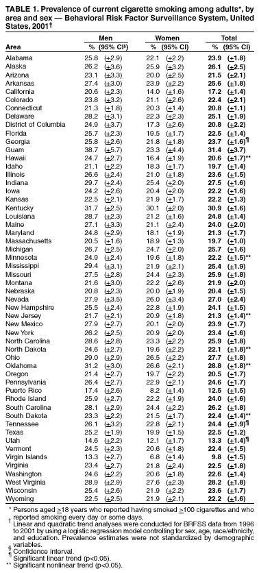 Persons using assistive technology might not be able to fully access information in this file. For assistance, please send e-mail to: mmwrq@cdc.gov. Type 508 Accommodation and the title of the report in the subject line of e-mail. Prevalence of Current Cigarette Smoking Among Adults and Changes in Prevalence of Current and Some Day Smoking --- United States, 1996--2001Tobacco use, particularly cigarette smoking, is the leading preventable cause of death in the United States and is responsible for approximately 440,000 deaths each year (1). One of the national health objectives for 2010 is to reduce the prevalence of cigarette smoking among adults to <12% (objective 27.1) (2). To examine the prevalence of smoking for the 50 states, the District of Columbia (DC), Guam, Puerto Rico, and the Virgin Islands, CDC analyzed data from the 2001 Behavioral Risk Factor Surveillance System (BRFSS). This report summarizes the results of that analysis, which indicate that, during 2001, the median adult current smoking prevalence was 23.4% (range: 13.3%--30.9%) for the states and DC, and 12.5% (range: 9.8%--31.4%) for Guam, Puerto Rico, and the Virgin Islands. During 1996--2001, the prevalence of current smoking was relatively stable in 41 states and DC, and the proportion of current smokers who were some day smokers increased significantly in 31 of those states and DC. Because the only safe alternative to smoking is cessation, interventions should target all smokers to help them quit smoking completely. BRFSS is a state-based, random-digit--dialed telephone survey of the non-institutionalized U.S. adult population aged >18 years. The 2001 BRFSS was conducted in the 50 states, DC, Guam, Puerto Rico, and the Virgin Islands. To determine current cigarette smoking, respondents were asked, "Have you smoked at least 100 cigarettes in your entire life?" and "Do you now smoke cigarettes every day, some days, or not at all?" "Current smokers" were defined as those who reported having smoked >100 cigarettes during their lifetime and who currently smoked every day or some days. "Some day" smokers were current smokers who responded that they smoked some days. Data on current smoking have been available since 1996. Estimates were weighted by the sex, age, and race/ethnicity distributions of each area's population, and 95% confidence intervals (CIs) were calculated by using SUDAAN. The median response rate was 63.2% (range: 45.6%--87.1%) in 1996 and 53.5% (range: 48.9%--63.2%) in 2001. Temporal changes in current smoking and the proportion of some day smokers among current smokers were analyzed for 1996--2001, controlling for sex, age, race/ethnicity, and education by using logistic regression analysis. Both linear and quadratic terms were included in the models. Quadratic trends indicated a significant but nonlinear trend in the data over time (i.e., leveling off or changing direction). In 2001, the median prevalence of current smoking in the 50 states and DC was 23.4% (range: 13.3%--30.9%) (Table 1). Prevalence was highest in Kentucky (30.9%), Oklahoma (28.8%), West Virginia (28.2%), Ohio (27.7%), Indiana (27.5%), Nevada (27.0%), South Carolina (26.2%), and Alaska (26.1%), and lowest in Utah (13.3%), California (17.2%), Massachusetts (19.7%), Idaho (19.7%), Nebraska (20.4%), Oregon (20.5%), Hawaii (20.6%), Connecticut (20.8%), and DC (20.8%). Current smoking prevalence was 9.8% in the Virgin Islands, 12.5% in Puerto Rico, and 31.4% in Guam. Smoking prevalence by sex varied significantly in 15 states and Guam, Puerto Rico, and the Virgin Islands, with rates being higher for men than for women. In the 50 states and DC, the median prevalence of cigarette smoking among men was 25.5% (range: 14.6%--31.7%) and among women was 21.5% (range: 12.1%--30.1%). Among both men and women, the prevalence was highest in Kentucky and lowest in Utah. In Guam, Puerto Rico, and the Virgin Islands, among both men and women, the prevalence was highest in Guam and lowest in the Virgin Islands. During 1996--2001, no change in the prevalence of current smoking was noted for 41 states and DC. Significant linear or quadratic trends were detected in current smoking for 1996--2001 in nine states. Among the nine states for which changes in current smoking prevalence were found, Georgia, Tennessee, and Utah had linear decreases; Hawaii had a nonlinear decrease; and Oklahoma had a non-linear increase. In addition, smoking prevalence declined and then increased in Minnesota and New Jersey, and increased and then declined steadily in South Dakota. The pattern in North Dakota was more complex: observed rates decreased during 1996--1998 followed by an increase through 2000 and a decline in 2001. During 2001, among the 50 states and DC, the median proportion of some day smokers among current smokers was 24.0% (range: 15.2% [Kentucky]-- 41.2% [DC]) (Table 2). During 1996--2001, significant linear increases in the proportion of some day smokers among current smokers were noted in 31 states and DC, and seven states had nonlinear increases (Arizona, Kansas, Maryland, Missouri, Nevada, Rhode Island, and South Carolina) (Table 2). For DC and 31 of the 38 states with significant time trends in the proportion of some day smokers among current smokers, no change in the prevalence of current smoking occurred during 1996--2001. Analysis of the combined data for 1996--2001 for all 50 states and DC indicated that the median proportion of some day smokers among current smokers was slightly higher among men than women (22.2% [range: 21.8%--22.7%] and 21.1% [range: 20.7%--21.5%], respectively) and decreased with age except for those aged >65 years (28.7% [range: 27.8%--29.7%], 22.1% [range: 21.7%--22.5%], 17.6% [range: 17.1%--18.1%], and 20.3% [range: 19.3%--21.2%], respectively, for those aged 18--24 years, 25--44 years, 45--64 years, and >65 years). Prevalence of some day smokers also was higher among Hispanics and non-Hispanic blacks than non-Hispanic whites (38.1