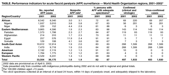 Persons using assistive technology might not be able to fully access information in this file. For assistance, please send e-mail to: mmwrq@cdc.gov. Type 508 Accommodation and the title of the report in the subject line of e-mail. Progress Toward Global Eradication of Poliomyelitis, 2002Since the 1988 World Health Assembly resolution to eradicate poliomyelitis globally (1) through 2002, the number of countries where polio is endemic declined from 125 to seven, and the estimated incidence of polio decreased >99% (2). In 2002, the European Region became the third World Health Organization (WHO) region certified as polio-free, joining the Region of the Americas and the Western Pacific Region, certified polio-free in 1994 and 2000, respectively (3--5). Despite these achievements, a provisional total of 1,920 polio cases were reported during 2002, a substantial increase from 483 in 2001, reflecting primarily the large polio epidemic in India (6). This report summarizes global progress achieved in polio eradication during 2002 and describes remaining challenges. Implementation of Polio Eradication StrategiesCoverage among infants with 3 doses of oral poliovirus vaccine (OPV3) in 2001 was estimated at 75% globally, a decrease from 82% in 2000.* Coverage varied among WHO regions, from 54% in the African Region to 95% in the European Region. Except for Egypt, reported routine vaccination coverage in 2002 continues to be low in the remaining countries where polio is endemic. All countries where polio is endemic and many countries where polio was recently endemic conducted supplemental immunization activities (SIAs) during 2002. An estimated 500 million children were vaccinated during 266 rounds of National Immunization Days (NIDs), sub-NIDs (SNIDs)§, or mopping-up activities. All countries used house-to-house vaccination in part or all of the SIA target areas. SIA monitoring data confirmed low vaccination coverage for some SIAs, particularly in Uttar Pradesh (India) and northern Nigeria, where poliovirus transmission remained intense. All WHO regions have achieved certification-standard acute flaccid paralysis (AFP) surveillance consisting of 1) an annual nonpolio AFP detection rate of >1 per 100,000 persons aged <15 years and 2) at least two adequate stool specimens¶ collected from >80% of persons with AFP (Table). The African Region reached certification-standard AFP surveillance quality for the first time in 2002, with a nonpolio AFP detection rate of 3.1 and adequate specimens collected from 81% of persons with AFP. Globally, the nonpolio AFP rate increased from 1.6 in 2001 to 1.9 in 2002. The proportion of persons with AFP from whom adequate stool specimens were collected increased from 82% in 2001 to 87% in 2002. Except for Somalia (adequate specimens from 67% of persons with AFP), all other countries where polio is endemic achieved certification-standard AFP surveillance in 2002. In 2002, a total of 97% of the 145 poliovirus laboratories in the global network were formally accredited by WHO. Global network laboratories tested approximately 70,000 fecal samples, a 12% increase over 2001. Despite a fourfold increase in the isolation of wild virus from 2001 to 2002 (Table), timeliness of reporting of laboratory results improved. Primary isolation results were available within 28 days of receipt in the national laboratory for 90% of samples, and intratypic differentiation was available within 28 days of isolate receipt in the regional reference laboratory for 88% of isolates. Impact on Wild Poliovirus TransmissionThe number of countries where polio is endemic decreased from 10 in 2001 to seven in 2002. Of the 1,920 polio cases reported in 2002, a total of 1,893 (99%) were reported from three countries: India (1,599), Nigeria (201), and Pakistan (93) (Figure). Despite certification-standard surveillance, few cases were reported in Afghanistan (11), Egypt (seven), Niger (three), and Somalia (three). Virus importations were detected in Zambia (two cases) and Burkina Faso (one case). Recently endemic poliovirus reservoir (Ethiopia, Angola, and Sudan) reported no cases in 2002 in the presence of sensitive surveillance. A substantial increase in polio occurred in India, from 268 cases reported in 2001 to 1,599 cases in 2002, representing >83% of the globally reported cases in 2002. The states of Uttar Pradesh and Bihar accounted for 1,241 (78%) and 121 (8%) of the total cases in India, respectively. During 2001--2002, the number of genetic lineages of wild poliovirus circulating in India remained the same for wild poliovirus type 1 (P1) (three major lineages) and wild poliovirus type 3 (P3) (four major lineages). Analysis of genetic data demonstrated that all lineages identified in India in 2002 were derived from strains that circulated in Utter Pradesh during 2000--2001. In Nigeria, the increased number of reported wild poliovirus cases was in part caused by improved AFP surveillance. Despite the increase, poliovirus circulation was restricted geographically, with seven states in northern Nigeria reporting >80% of cases; southern Nigeria remained largely poliovirus-free. Pakistan reported 22% fewer cases in 2002 (93) compared with 2001 (119). In addition, transmission was more focal in 2002 compared with 2001. Genetically related P3 clusters decreased from six in 2001 to one in 2002. Egypt continued to report P1 in 2002. Since 2000, environmental surveillance has detected evidence of widespread P1 transmission in Upper and Lower Egypt, compared with AFP surveillance, which detected few poliovirus-confirmed cases. During the second half of 2002, seven cases of polio were detected from Upper and Lower Egypt, including the greater Cairo area. In Somalia, the last polio case was reported in October 2002 and was caused by P3. Only eleven poliovirus-confirmed cases were reported in 2002 in Afghanistan, despite the recent war and return of approximately 2 million refugees. Genetic sequencing data indicat