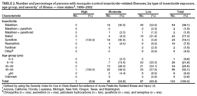 Persons using assistive technology might not be able to fully access information in this file. For assistance, please send e-mail to: mmwrq@cdc.gov. Type 508 Accommodation and the title of the report in the subject line of e-mail. Surveillance for Acute Insecticide-Related Illness Associated with Mosquito-Control Efforts --- Nine States, 1999--2002Ground and aerial applications of insecticides are used to control populations of adult mosquitoes, which spread such diseases as West Nile virus--related illness, eastern equine encephalitis, and dengue fever (1). This report summarizes investigations of illnesses associated with exposures to insecticides used during 1999--2002 to control mosquito populations in nine states (Arizona, California, Florida, Louisiana, Michigan, New York, Oregon, Texas, and Washington) (estimated 2000 population: 118 million). The findings indicate that application of certain insecticides posed a low risk for acute, temporary health effects among persons in areas that were sprayed and among workers handling and applying insecticides. To reduce the risk for negative health effects, public health authorities should 1) provide public notice of application times and locations and appropriate advice about preventing exposures, 2) ensure that insecticide handlers and applicators meet state-mandated training and experience requirements to prevent insecticide exposure to themselves and the public, and 3) implement integrated pest management control strategies that emphasize mosquito larval control, reduction of mosquito breeding sites, and judicious use of insecticides to control adult mosquito populations. Staff in state-based pesticide poisoning surveillance programs identified patients who had been exposed to insecticides used in mosquito-control efforts in nine states during April 1999--September 2002. Information was gathered on persons who had illnesses consistent with the national case definition for pesticide poisoning, which requires the collection of data on pesticide exposure, health effects, and toxicologic evidence supporting an association between exposure and effect (2,3). Cases of insecticide-related illness or injury were classified as either definite, probable, or possible, depending on the certainty of exposure and whether health effects were signs observed by a health-care provider or symptoms reported by a patient (2,3). Of the 133 cases of acute insecticide-related illness associated with mosquito control that were identified, two (1.5%) were classified as definite, 25 (18.8%) as probable, and 106 (79.7%) as possible. Of the 132 cases for which work-relatedness could be assessed, 36 (27.3%) were work-related and 96 (72.7%) were not work-related; 31 (86.1%) of the 36 work-related cases occurred among males, and 66 (68.8%) of the 96 cases that were not work-related occurred among females. Of the 49 cases identified in 2001, a total of 29 (59.2%) were related to a single event at a softball game in which workers operating a mosquito-control truck inadvertently sprayed 29 persons (16 spectators, 12 players, and one coach) with Fyfanon ULV®, which contains malathion. All 29 persons were treated in emergency departments (EDs). Of the 133 persons with acute insecticide-related illness associated with mosquito control, 35 (26.3%) were identified from monitoring media reports (including 34 reported subsequently by health-care providers), 32 (24.1%) were reported by poison-control centers, 27 (20.3%) were self-reported, and seven (5.3%) were reported by state health departments. Physicians and EDs were responsible for initial reporting of five and three cases, respectively. The remaining cases were reported initially by friends or relatives (n = seven), government agencies (n = five), employers (n = four), laboratories (n = two), and other sources (n = six). Of the 85 persons with reported illness who were known to have sought medical care, 45 (52.9%) were treated in EDs, 35 (41.2%) were treated in physicians' offices, four (4.7%) were treated in employee health centers, and one (1.2%) was hospitalized. An additional 16 persons received advice from a poison-control center, and 15 did not seek medical care; information about medical treatment was not available for 17 persons. Of the 133 reported cases of pesticide-related illness, 95 (71.4%) cases were associated with organophosphates, primarily malathion. Malathion alone was associated with 64 (67.4%) of the 95 cases; 37 (27.8%) cases were associated with pyrethoids, primarily sumithrin (24 cases) and resmethrin (10 cases) (Table 1). Illness severity was categorized for all cases (4). One exposure was associated with illness of high severity (Table 2). When her neighborhood was sprayed, a woman aged 54 years was exposed to sumithrin, which passed through operating window fans and a window air conditioner. She had exacerbation of her asthma and chronic obstructive pulmonary disease. The majority of the remaining cases were of low (65.4%) or moderate (33.8%) severity. The majority of cases were associated either with respiratory (66.2%) or neurologic (60.9%) dysfunction. Other systems affected were gastrointestinal (45.1%), ocular (36.1%), dermal (27.1%), cardiovascular (12.0%), renal-genitourinary (3.0%), and miscellaneous (28.6%). Of 36 persons who were exposed at their workplaces (Table 1), 14 (38.9%) were insecticide applicators, and 22 (61.1%) were performing tasks that did not involve pesticide application. Seven (50.0%) of 14 applicators were exposed to sumithrin; of the other 22 workers, 11 (50%) were exposed to malathion, and five (22.7%) were exposed to resmethrin. Illness of moderate severity was more frequent among applicators (42.9%) than nonapplicators (27.3%). Reported by: MP Mauer, DO, New York State Dept of Health. R Rosales, J Sievert, M Propeck, Texas Dept of Health. A Becker, MPH, Florida Dept of Health. E Arvizu, M Hadzizanovic, MD, Arizona Dept of Health Svcs. L Mehler, MD, California Dept