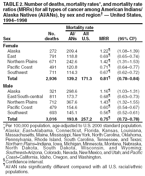 Persons using assistive technology might not be able to fully access information in this file. For assistance, please send e-mail to: mmwrq@cdc.gov. Type 508 Accommodation and the title of the report in the subject line of e-mail. Cancer Mortality Among American Indians and Alaska Natives --- United States, 1994--1998In the United States, public health interventions to control infectious diseases, lower infant and maternal mortality, and improve basic sanitation have led to a substantial increase in life expectancy for American Indians and Alaska Natives (AI/ANs). During 1940--1995, average life expectancy among AI/ANs increased 39%, from 51 years in 1940 to 71 years in 1995; however, AI/ANs experienced a parallel increase in mortality rates for chronic diseases, including cancer, which is the second leading cause of death for AI/ANs nationally and the leading cause of death among Alaska Natives (1,2). A previous study examining cancer mortality rates during 1989--1993 documented lower cancer mortality rates for AI/ANs than for the overall U.S. population, with regional variation (3). To understand cancer mortality among AI/ANs subsequent to that period, the Indian Health Service (IHS) and CDC analyzed death certificate data provided by CDC's National Center for Health Statistics for deaths among AI/ANs in five U.S. geographic regions* during 1994--1998. This report summarizes the results of that analysis, which indicate that cancer mortality rates among AI/ANs nationally were lower than cancer mortality rates for all U.S. racial/ethnic populations combined. Rates for AI/ANs varied by region, with the highest rates found in the Alaska and the Northern Plains regions. Plans or modifications for cancer prevention and treatment programs should account for regional variation, and programs to discourage smoking initiation, encourage tobacco cessation, and promote colorectal cancer screening among AI/ANs in the Alaska and the Northern Plains regions should be expanded. The analysis was limited to deaths of persons classified as AI/ANs on death certificates who at death were residents of counties on or adjacent to tribal reservations recognized by the Federal government (i.e., counties served by IHS). Denominator data for rate calculations for AI/ANs in the same counties reflected adjustments made to intercensal estimates for 1994--1998 on the basis of the 2000 decennial census (4). The AI/AN population of these counties comprised approximately 60% of persons in the United States who identified themselves as AI/ANs in the decennial census. Annualized mortality rates per 100,000 population adjusted to the 2000 standard population were calculated by using 10-year age intervals for the five regions. In addition, mortality rate ratios (MRRs) and 95% confidence intervals were calculated to compare rates with the overall U.S. population (5). The overall cancer mortality rate among AI/ANs (161.4 per 100,000 population) was lower than the U.S. rate for all racial/ethnic populations combined (205.5) (Table 1). The cancer mortality rate was 193.8 for males and 139.2 for females (Table 2). Rates were higher than the overall U.S. rate in the Alaska (248.9) and the Northern Plains regions (291.7); in both regions, excess mortality was attributed to cancer of the lung, colorectum, liver, stomach, and gallbladder. In contrast, the lung cancer mortality rate among AI/ANs in the Southwest region was fourfold lower than the overall U.S. rate for all racial/ethnic populations combined. Cervical cancer mortality rates were higher among AI/ANs than among all racial/ethnic populations (3.7 and 2.6, respectively), particularly in the East and Northern Plains regions, and breast cancer mortality rates were lower among AI/ANs than among all racial/ethnic populations (17.0 and 29.4, respectively), particularly in the East, Pacific Coast, and Southwest regions. Rates for lung cancer mortality, the leading cause of cancer death for all AI/AN populations combined, varied by region; rates in the Alaska (78.1) and the Northern Plains regions were higher than the U.S. rate for all racial/ethnic populations combined (57.8) but low in the Southwest region (14.1). Rates for colorectal cancer, the second most common cause of AI/AN cancer mortality, also varied by region. The Alaska and the Northern Plains regions had the highest MRRs (1.78 and 1.59, respectively), and the Southwest region (0.54) had the lowest; in other regions, MRRs were below the overall U.S. rates for all racial/ethnic populations combined. In the East region, 80% of AI/AN cancer deaths occurred among AI/ANs living in Oklahoma. Reported by: R Paisano, MHSA, N Cobb, MD, National Epidemiology Program, Indian Health Svc. DK Espey, MD, Div of Cancer Prevention and Control, National Center for Chronic Disease Prevention and Health Promotion, CDC. Editorial Note:Although the cancer mortality rate for AI/ANs was lower than the U.S. rate for all racial/ethnic populations combined, rates were higher for some cancer types and varied by region. In particular, mortality rates for all types of cancer combined were higher among AI/ANs in the Alaska and Northern Plains regions than the overall U.S. rate for all racial/ethnic populations combined. Rates for lung cancer mortality were consistent with known regional patterns of cigarette smoking for AI/AN communities across the United States (6). Although colorectal cancer mortality patterns are more difficult to account for than regional variation in lung cancer mortality, contributing factors might include diet, physical activity levels, genetic predisposition, and access to, or use of, clinical preventive services. Although breast cancer mortality rates were lower among AI/AN women in all regions than among all U.S. women, breast cancer is the second leading cause of cancer death among AI/AN women. Few breast cancer screening services were available to AI/AN women before the National Breast and Cervical Cancer Early Detectio