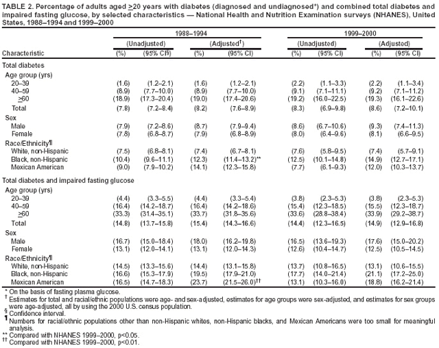 Persons using assistive technology might not be able to fully access information in this file. For assistance, please send e-mail to: mmwrq@cdc.gov. Type 508 Accommodation and the title of the report in the subject line of e-mail. Prevalence of Diabetes and Impaired Fasting Glucose in Adults --- United States, 1999--2000Diabetes and its complications are major causes of morbidity and mortality in the United States and contribute substantially to health-care costs. Data from the National Health Interview Survey (NHIS) and the Behavioral Risk Factor Surveillance System (BRFSS) have documented steady increases in the prevalence of diabetes (1,2). However, these surveys rely only on self-reports of previously diagnosed diabetes and cannot measure the prevalence of undiagnosed diabetes. The change in prevalence demonstrated by these data might reflect other factors such as enhanced detection rather than true increases. The National Health and Nutrition Examination surveys (NHANES) are the only nationally representative surveys that examine both diagnosed and undiagnosed diabetes. During 1976--1980 (NHANES II) and 1988--1994 (NHANES III), the overall combined prevalence of diabetes (diagnosed and undiagnosed on the basis of fasting glucose) increased (3). This report presents data on prevalence of diagnosed and undiagnosed diabetes and impaired fasting glucose from NHANES 1999--2000 and NHANES III (1988--1994). The findings indicate that diabetes and impaired fasting glucose continue to affect a major proportion of the U.S. population. An estimated 29 million (14.4%) persons aged >20 years had either diagnosed diabetes, undiagnosed diabetes, or impaired fasting glucose; 29% of diabetes cases were undiagnosed. Persons can reduce their risk for diabetes through weight management and physical activity. NHANES 1999--2000 (4) was designed to be nationally representative of the U.S. civilian, noninstitutionalized population on the basis of a complex, multistage probability sample. Survey participants were interviewed in their homes and subsequently received physical examinations in mobile examination centers. The household interview was completed by 81.9% of eligible subjects, including 4,880 persons aged >20 years. Persons were asked if, other than during pregnancy for women, a doctor or a health-care professional had ever told them they had diabetes. From these responses, 480 persons aged >20 years were classified as having previously diagnosed diabetes. Of 1,996 persons aged >20 years without diagnosed diabetes who were randomly assigned to a morning examination session and who fasted 9 to <24 hours, plasma glucose values were obtained for 1,734 (87%). Plasma glucose was measured by using a hexokinase enzymatic method with a coefficient of variation of <2.5% during the 2 years of the survey. Diagnostic criteria of the American Diabetes Association (ADA) were used to categorize persons without previously diagnosed diabetes as to whether they had undiagnosed diabetes (fasting plasma glucose >126 mg/dL) or impaired fasting glucose (fasting plasma glucose 110 to <126 mg/dL) (5). Findings from NHANES 1999--2000 were compared with those from NHANES III (1988--1994), which used similar procedures (3). Sampling weights for the interviewed sample and the morning plasma glucose sample were incorporated to provide estimates that were representative of the U.S. population. Prevalence based on fasting glucose in the morning sample of persons without diagnosed diabetes was adjusted as described previously (6) so estimates based on these data would represent the total U.S. population. Age- and sex-adjusted rates were computed by the direct method by using U.S. 2000 Census data, with age categories of 20--39, 40--59, and >60 years. Replicated variance estimation methods were used to calculate the standard errors, accounting for both the complex sample design and the use of both interview and morning examination sample data in combination. Two sample t-tests were used to test differences in proportions. The estimated unadjusted prevalence of previously diagnosed diabetes in adults aged >20 years during 1999--2000 was 5.9% (95% confidence interval [CI] = 4.9--6.9) (Table 1), representing 11.8 million (95% CI = 9.8--13.8 million) U.S. adults. The prevalence increased by age, reaching 15.0% (95% CI = 12.6--17.5) among persons aged >60 years. Rates were similar by sex. The adjusted prevalence was significantly lower in non-Hispanic whites compared with Mexican Americans and non-Hispanic blacks. The unadjusted prevalence of undiagnosed diabetes based on fasting glucose in adults aged >20 years was 2.4% (95% CI = 1.5--3.4) during 1999--2000, representing 4.9 million (95% CI = 3.0--6.8 million) U.S. adults. Prevalence increased slightly with age and was similar in men and women. Rates were similar by race/ethnicity. Combining diagnosed and undiagnosed diabetes (Table 2), the unadjusted prevalence of total diabetes during 1999--2000 was 8.3% (95% CI = 6.9--9.8), affecting an estimated 16.7 million (95% CI = 13.8--19.6 million) persons aged >20 years. Differences in prevalence by age, sex, and race/ethnicity mirrored those for diagnosed diabetes. During 1999--2000, the proportion of total diabetes that was undiagnosed was 29% (95% CI = 21%--38%). The overall prevalence of diagnosed diabetes, undiagnosed diabetes, total diabetes, and the overall proportion of total diabetes that was undiagnosed did not change significantly from 1988--1994 to 1999--2000. Overall prevalence of impaired fasting glucose during 1999--2000 was 6.1% (95% CI = 4.4--7.9) (Table 1), representing 12.3 million (95% CI = 8.8--15.8 million) persons aged >20 years. Rates increased with age, were higher in men (7.9%) (95% CI = 5.5--10.2) than in women (4.5%) (95% CI = 2.8--6.2), and were similar by race/ethnicity. The overall decrease in prevalence observed from 1988--1994 to 1999--2000 was not statistically significant. During 1999--2000, the combined un