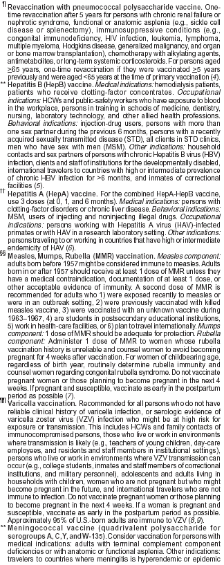 Persons using assistive technology might not be able to fully access information in this file. For assistance, please send e-mail to: mmwrq@cdc.gov. Type 508 Accommodation and the title of the report in the subject line of e-mail. Notice to Readers: Recommended Adult Immunization Schedule --- United States, 2003--2004In June 2003, the Advisory Committee on Immunization Practices (ACIP) approved the revised Adult Immunization Schedule for 2003--2004. The format has been revised to better represent the schedule's two components, by age group and by medical condition (Figures 1 and 2) and better indicate how the footnotes apply to both figures. Revisions to the schedule and footnotes include 1) additional information regarding use of tetanus-diphtheria toxoids as prophylaxis in wound management; 2) clarification regarding the number of doses of the measles component of the measles-mumps-rubella vaccine; 3) guidance regarding the use of intranasally administered, live, attenuated influenza vaccine for healthy persons aged 5--49 years; 4) recommendations regarding administering influenza vaccination to pregnant women with or without pre-existing chronic diseases or conditions; and 5) added information regarding influenza and consideration of Haemophilus influenzae type b vaccine for asplenic persons. Two measures initiated by the Centers for Medicare and Medicaid Services (CMS) are expected to increase vaccination among Medicare and Medicaid beneficiaries. First, in 2002, CMS enacted a new regulation allowing for the use of standing orders at Medicare- and Medicaid-participating hospitals, long-term--care facilities, and home-health agencies to deliver influenza and pneumococcal vaccinations (1) as recommended by ACIP (2) and the Task Force on Community Preventive Services (3). Second, CMS increased reimbursement rates for administering hepatitis, influenza, and pneumococcal vaccines from a national average of $3.98 in 2002 to $7.72 in 2003 (4). In addition, expansion of the National Committee for Quality Assurance's Health Plan Employer Data and Information Set to include quality indicators on influenza vaccinations for persons aged 50--64 years in 2001 and pneumococcal vaccinations for persons aged >65 years in 2002 might improve vaccination-delivery services at managed-care organizations (5,6). Health-care providers are reminded they should administer influenza vaccinations to all persons aged >50 years, regardless of preexisting medical conditions (7). Family physicians, internists, obstetrician/gynecologists, and other providers in private practice are urged to use the Adult Immunization Schedule in conjunction with the Standards for Adult Immunization Practices (8). Evidence indicates that chart reminders, patient reminders/recalls, and standing orders will reduce missed opportunities to vaccinate (9,10). General information regarding adult immunization and vaccinating immunosuppressed persons can be obtained from state and local health departments and from CDC's National Immunization Program at http://www.cdc.gov/nip. The 2003--2004 Adult Immunization Schedule is available at http://www.cdc.gov/nip/recs/adult-schedule.htm. Vaccine information statements are available at http://www.cdc.gov/nip/publications/vis. ACIP statements for each recommended vaccine are available at http://www.cdc.gov/nip/publications/acip-list.htm. In addition, instructions for reporting adverse events after vaccination to the Vaccine Adverse Event Reporting System are available at http://www.vaers.org or by telephone, 800-822-7967. References