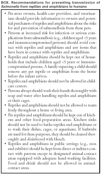 Persons using assistive technology might not be able to fully access information in this file. For assistance, please send e-mail to: mmwrq@cdc.gov. Type 508 Accommodation and the title of the report in the subject line of e-mail. Reptile-Associated Salmonellosis --- Selected States, 1998--2002During 1998--2002, CDC received reports from state health departments regarding Salmonella infections in persons who had contact with reptiles (e.g., lizards, snakes, and turtles). Salmonella infections usually cause gastroenteritis but can result in invasive illness (e.g., septicemia and meningitis), especially in infants and immunocompromised persons. For decades, reptiles have been known as a source for salmonellosis (1); however, numerous reptile owners remain unaware that reptile contact places them and other household members, including children, at greater risk for salmonellosis (2). Increasing evidence suggests that amphibians (e.g., frogs, toads, newts, and salamanders) also can pose risks for salmonellosis in humans (3,4). This report describes cases of reptile-associated salmonellosis in six states*, offers recommendations on preventing transmission of Salmonella from reptiles and amphibians to humans (Box, and provides an update on state regulations mandating education at pet stores about salmonellosis. Case ReportsCalifornia. During December 2001, an infant aged 3 months was taken to an emergency department (ED) after 1 day of bloody diarrhea and fever. The infant was sent home with no therapy and recovered in 2 days; a stool specimen yielded Salmonella serotype Nima. Although no reptiles lived in the home, the infant's father was a high school biology teacher who handled reptiles in the classroom, including a large snake (i.e., a boa) that he often draped over his shoulders. A stool culture from the snake grew S. Nima. When interviewed, the father indicated that he knew reptiles carry Salmonella and was careful to wash his hands after handling them or their containers. However, he did not change clothing when he came home from work before holding his child. Connecticut. During June 2002, a child aged 21 months was admitted to a hospital with fever, abdominal cramps, and bloody diarrhea. The child received no antibiotic therapy and was discharged the next day. Blood and stool cultures yielded Salmonella serotype Poona. A sibling aged 6 years also had fever and bloody diarrhea and a stool culture that yielded S. Poona. The family had purchased an iguana approximately 1 month earlier. The children had cleaned the iguana's cage and handled the iguana 2 days before their illness onsets. A stool culture from the iguana grew S. Poona; isolates from the iguana and the two siblings were indistinguishable by pulsed-field gel electrophoresis (PFGE). Florida. During January 2000, an infant aged 1 month visited a clinic with fever and diarrhea; the infant was not hospitalized. A stool specimen yielded Salmonella serotype Tennessee. One week before illness onset, the infant's family moved into a household that contained a bearded dragon (i.e., Pogona vitticeps). The pet reptile's cage had been washed in the kitchen near the infant's bottle nipples. A stool culture from the bearded dragon yielded S. Tennessee. Isolates from the infant and the bearded dragon were indistinguishable by PFGE. An adult in the house reported being aware that turtles and iguanas are reservoirs for Salmonella but unaware that all reptiles can carry Salmonella. The bearded dragon was placed outside the home and later donated to a zoo. North Dakota. During March 1998, twin infants aged 2 weeks were admitted to a hospital after 1 day of poor feeding, diarrhea, and fever. They were treated intravenously with ampicillin for 6 days. The infants' mother and a child aged 3 years in the home also had diarrhea. Stool specimens from one of the twins, the mother, and the older child yielded Salmonella with the partial serotype O group 44, 45, 47, 48, or 50, H antigen G complex. The family recently had acquired an iguana, which was not allowed out of its cage. Only the mother handled the reptile and cleaned the cage. When the family learned that the iguana was the probable source of Salmonella infections, the iguana was euthanized. Culture of intestinal contents from the iguana yielded Salmonella with the same partial serotype as the patients' isolates. The clinical isolate from the twin was sent to CDC for complete serotyping and found to be Salmonella serotype IV 48:g,z51:- (known formerly as S. Marina). Ohio. During August--October 2000, local health departments reported seven gastrointestinal illnesses associated with iguanas or turtles acquired at county fairs. In one incident, two siblings aged 11 and 13 years with diarrhea and abdominal cramping visited an ED. No stool specimens were collected from the children. However, stool specimens from a turtle that the siblings received at a county fair yielded Salmonella serotype Sandiego. During the same period, a stool specimen from a man aged 20 years with diarrhea also yielded S. Sandiego; he recently had won a turtle at a county fair. Isolates from the children's turtle and the man were indistinguishable by PFGE. Wisconsin. During November 2002, an infant aged 24 days was admitted to a hospital after 1 day of bloody diarrhea. The infant was hospitalized for 3 days and received intravenous fluids and supportive care. A stool culture yielded Salmonella serotype IV 44:z4z23:-. The infant was treated for 14 days with oral amoxicillin. An iguana was reported living in the home of the infant's father; however, attempts to collect stool samples from the iguana were unsuccessful. Two weeks later, an infant aged 4 months in a neighboring county visited a hospital after 8 days of fever of 100.3° F (37.9° C) and 3 days of decreased range of motion in the left hip. Salmonella serotype IV 44:z4z23:- was isolated from both left hip aspirate and blood cultures. The infant was hospitalized for 6 d
