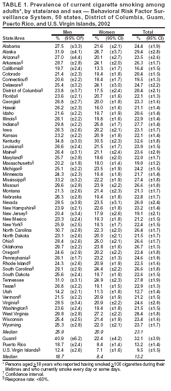 Persons using assistive technology might not be able to fully access information in this file. For assistance, please send e-mail to: mmwrq@cdc.gov. Type 508 Accommodation and the title of the report in the subject line of e-mail. State-Specific Prevalence of Current Cigarette Smoking Among Adults ---United States, 2002Cigarette smoking in the United States causes serious illnesses among an estimated 8.6 million persons (1) and approximately 440,000 deaths annually (2), resulting in $157 billion in health-related economic costs (2). To reduce smoking prevalence, morbidity, mortality, and economic impact, state tobacco-control programs should include interventions to help persons stop smoking (3). To assess the prevalence of current cigarette smoking among adults, attempts to quit, and receipt of physician advice to quit during the preceding year, CDC analyzed data from the 2002 Behavioral Risk Factor Surveillance System (BRFSS) survey. This report summarizes the results of that analysis, which indicated a threefold difference in smoking prevalence across the 50 states, the District of Columbia (DC), Guam, Puerto Rico, and the U.S. Virgin Islands (range: 9.5%--32.6%) (Figure). To support smokers' attempts to quit, states/areas should implement comprehensive tobacco-control programs that include interventions to help persons stop smoking (e.g., quitlines). BRFSS is a state-based, random-digit--dialed telephone survey of the noninstitutionalized, civilian U.S. population aged >18 years. Because BRFSS data are state-specific, median prevalences were reported rather than national averages. Estimates were weighted by age, race/ethnicity, and sex distribution of each state's population, and 95% confidence intervals were calculated by using SUDAAN. The median response rate across states/areas was 58.3% (range: 42.2%--82.6%). Current cigarette smoking status was determined by asking respondents, "Have you smoked at least 100 cigarettes in your entire life?" and "Do you now smoke cigarettes every day, some days, or not at all?" Current smokers were defined as those who reported having smoked >100 cigarettes during their lifetimes and who currently smoke every day or some days. Attempted smoking cessation was assessed by asking every day smokers, "During the past 12 months, have you stopped smoking for 1 day or longer because you were trying to quit?" Respondents in 23 states and the U.S. Virgin Islands also were asked about receipt of physician advice to quit. Current smokers who had visited a health-care professional were asked, "In the past 12 months, has a doctor, nurse, or other health professional advised you to quit smoking?" Cigarette Smoking PrevalenceDuring 2002, the median prevalence of current smoking in the 50 states and DC was 23.1% (range: 12.7% [Utah]--32.6% [Kentucky]) (Table 1). Current smoking prevalence also was highest in Alaska (29.4%), West Virginia (28.4%), Tennessee (27.8%), and Indiana (27.7%). Smoking prevalence was lowest in Utah (12.7%), California (16.4%), Massachusetts (19.0%), New Jersey (19.1%), and Connecticut (19.5%). In other areas, current smoking prevalence was 32.1% in Guam, 13.2% in Puerto Rico, and 9.5% in the U.S. Virgin Islands. The median smoking prevalence in the 50 states and DC was higher for men (25.9% [range: 14.2%--34.8%]) than for women (20.9% [range: 11.3%--30.5%]). Kentucky had the highest prevalence for both men (34.8%) and women (30.5%), and Utah had the lowest prevalence for both men (14.2%) and women (11.3%). Attempts to Quit SmokingAmong the 50 states and DC, the median proportion of everyday smokers who tried to quit smoking during the preceding year was 52.0% (range: 42.4% [Hawaii]--66.2% [Utah]) (Table 2). Among respondents in the 23 states who were asked about receipt of physician advice to quit, the median proportion of current smokers who had received advice to quit during the preceding year was 72.0% (range: 64.0% [Wisconsin]--83.7% [Maine]) (Table 2). Overall, the median proportion of current smokers who had received advice to quit during the preceding year did not vary substantially by age, race/ethnicity, or sex. Reported by: J Bombard, MSPH, A Trosclair, MS, M Schooley, MPH, C Husten, MD, Office of Smoking and Health, National Center for Chronic Disease Prevention and Health Promotion, CDC. Editorial Note:One of the national health objectives for 2010 is to reduce the prevalence of current smoking among adults to <12% (objective 27-1) (4). The findings in this report indicate that this objective has been achieved only in the U.S. Virgin Islands. The median proportion of everyday smokers who stopped smoking for >1 day was 52.0%, compared with 45.0% in 1996 (CDC, unpublished data, 1996). This increase in quit attempts might reflect decreased acceptability of smoking, an increase in clean-indoor--air laws and policies, and higher taxes implemented by certain states. In addition, the proportion of current smokers who had been advised to quit was 72.0%, which was higher than estimates from other surveys (5), although comparisons are limited by the number of states that asked the question. This increase might reflect efforts within health-care systems to increase treatment for tobacco users through proven interventions and system-level changes (e.g., physician reminders to provide counseling). The increases also might be attributed to expanded tobacco-control programs at the state level, including the expansion of evidence-based, telephone quitline services (6). During 1992--2002, states offering some form of quitline services increased from one to 32. Physicians often lack the time and often are not comfortable providing cessation counseling. Establishing readily accessible, free counseling services (e.g., quitlines) increases the availability of more intensive cessation assistance and might also encourage health-care providers to assess tobacco use and provide both advice to quit and medication (7). The findings in this report are sub