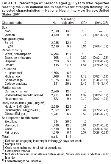 Persons using assistive technology might not be able to fully access information in this file. For assistance, please send e-mail to: mmwrq@cdc.gov. Type 508 Accommodation and the title of the report in the subject line of e-mail. Strength Training Among Adults Aged >65 Years --- United States, 2001Strength training (also referred to as resistance training) enables adults to improve their overall health and fitness by increasing muscular strength, endurance, and bone density and by improving their insulin sensitivity and glucose metabolism (1). For older adults (i.e., persons aged >65 years), strength-training exercises are recommended to decrease the risk for falls and fractures (2) and to promote independent living (Figure) (3). The American College of Sports Medicine recommends that adults include strength training as part of a comprehensive physical activity program (1). A national health objective for 2010 is to increase to 30% the proportion of adults who perform, >2 days per week, physical activities that enhance and maintain muscular strength and endurance (objective 22-4) (4). To determine the percentage and characteristics of older adults who perform strength training consistent with this objective, CDC analyzed data from the 2001 National Health Interview Survey (NHIS). This report summarizes the results of that analysis, which indicated that approximately 12% of persons aged 65--74 years and 10% of persons aged >75 years met the strength-training objective. These findings underscore the need for programs that encourage older adults to incorporate strength training into their lives along with regular physical activity. NHIS consists of face-to-face interviews that collect information on health, health care, health behaviors, and related factors. The 2001 survey used a stratified, multistage probability sample representative of the U.S. civilian, noninstitutionalized population. The overall response rate among selected adults was 73.8% (5). Data were collected from 6,152 respondents aged >65 years, and SUDAAN was used to account for the complex sampling design and sampling weights. A total of 615 respondents were excluded because of missing data on height and weight, health status, physical activity levels, and demographic characteristics; the final sample size was 5,537. Respondents were asked, "How often do you do physical activities specifically designed to strengthen your muscles, such as lifting weights or doing calisthenics?" Respondents were categorized as meeting the national strength-training objective if they engaged in strength training >2 days per week (4). Multivariate logistic regression analysis was used to test for associations between meeting the strength-training objective and specific characteristics of the older adults. Models accounted for sex, age, race/ethnicity, education, marital status, body mass index (BMI), and self-reported health status. Respondents also were asked about their participation in leisure-time physical activities (e.g., exercise, sports, and physically active hobbies) and how often they engaged for >10 minutes in 1) vigorous activities that caused heavy sweating or large increases in breathing or heart rate and 2) light or moderate activities that caused only light sweating or slight or moderate increases in breathing or heart rate. On the basis of the frequency and duration of their reported activities, respondents were categorized consistent with the national health objective for physical activity (objective 22-2) (4) as "active" (i.e., engaging in moderate-intensity physical activity for >30 minutes, >5 days per week, or in vigorous-intensity physical activity for >20 minutes, >3 days per week), "insufficiently active" (i.e., active at less than recommended levels), or "inactive" (i.e., engaging in no physical activity). Approximately 11% of respondents aged >65 years reported that they engaged in strength training >2 days per week (Table 1). Women were less likely than men (odds ratio [OR] = 0.74; 95% confidence interval [CI] = 0.61--0.90) to meet the objective. The likelihood of meeting the objective declined with advancing age and increased with level of education. Respondents who were obese (i.e., BMI >30 kg/m2) were less likely (OR = 0.59; 95% CI = 0.45--0.77) than those of healthy weight to meet the objective. Those reporting fair or poor health were less likely (OR = 0.37; 95% CI = 0.26--0.51) to meet the objective than those in excellent health. Among older adults categorized as physically active, 24.7% engaged in strength training (Table 2). Persons categorized as inactive (OR = 0.13; 95% CI = 0.10--0.16) and persons categorized as insufficiently active (OR = 0.50; 95% CI = 0.40--0.62) were less likely to engage in strength training than persons in the physically active group. An estimated 5.6% of respondents met the national objectives for both physical activity and strength training. Reported by: J Kruger, PhD, DR Brown, PhD, DA Galuska, PhD, D Buchner, MD, Div of Nutrition and Physical Activity, National Center for Chronic Disease Prevention and Health Promotion, CDC. Editorial Note:The findings in this report indicate that, in 2001, the majority of older adults, including those who met the national objective for physical activity, did not engage in strength training. These results suggest the need for targeted programs to encourage certain older-adult populations (e.g., women and persons who are less educated, obese, or physically inactive) to increase strength training. These populations are similar to those previously identified among persons aged >18 years who were less likely to engage in weight lifting >2 days per week (6). During 1998--2001, the proportion of older adults who met the national objective for strength training increased from 10% in 1998 (4) to 12% in 2001 among those aged 65--74 years and from 7% (4) to 10% among those aged >75 years. However, these prevalences remained less than half the 2010 nation