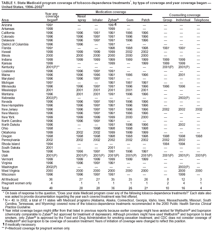Persons using assistive technology might not be able to fully access information in this file. For assistance, please send e-mail to: mmwrq@cdc.gov. Type 508 Accommodation and the title of the report in the subject line of e-mail. State Medicaid Coverage for Tobacco-Dependence Treatments --- United States, 1994--2002In 2000, of approximately 32 million persons who received health insurance coverage through Medicaid programs (1), an estimated 11.5 million (36%) smoked (CDC, unpublished data, 2000). One of the national health objectives for 2010 is to provide coverage* by Medicaid in the 50 states and the District of Columbia (DC) for nicotine-dependence treatment (objective 27.8b) (2). The Guide to Community Preventive Services recommends reducing the cost of tobacco-dependence treatments to increase the number of smokers who successfully quit smoking (3). The 2000 Public Health Service (PHS) Clinical Practice Guideline also supports expanded insurance coverage for tobacco-dependence treatments (4). The amount and type of coverage for tobacco-dependence treatment offered by Medicaid has been reported previously for 1998, 2000, and 2001 (5--7). In 2002, all states and DC were surveyed again about the amount and type of coverage they provided. This report summarizes the results of the survey, which indicate that as of December 31, 2002, 1) 36 Medicaid programs covered some tobacco-dependence counseling or medication for all Medicaid recipients, 2) four states offered coverage only for pregnant women, 3) two states offered coverage for all pharmacotherapy and counseling treatments recommended by the 2000 PHS guideline, and 4) seven states covered all recommended medications and at least one form of counseling. To improve the health of populations with disproportionately high rates of smoking, the 50 states and DC should provide coverage under Medicaid for all recommended tobacco-dependence treatments. In 2002, state Medicaid program directors were asked to identify staff members who were most knowledgeable about tobacco-dependence treatment coverage and programs; a survey was faxed to the identified staff member in each state and DC. After additional follow-up was conducted through telephone, e-mail, and fax, the response rate was 100%. The survey included 25 questions about coverage of tobacco-dependence treatments, the year coverage was first offered, treatments offered specifically to pregnant women, awareness and use of the 2000 PHS guideline (4), any program requirements related to patient copayments for or provider coverage of tobacco-dependence treatments, and whether Medicaid recipients were notified of the availability of covered tobacco-dependence treatments. So that survey responses could be validated, all Medicaid program respondents were asked to submit a written copy of their coverage policies for tobacco-dependence treatments or other related documentation. Of 40 Medicaid programs that reported offering coverage, 30 (75%) provided supporting documentation (i.e., detailed benefit documentation [23], drug benefit documentation [four], and substance abuse benefit documentation [three]). Ten (25%) programs did not submit any documentation. In 2002, a total of 36 (71%) Medicaid programs reported offering coverage for at least one form of tobacco-dependence treatment for all Medicaid recipients (Table 1); in 2001, a total of 35 programs offered coverage (7). In 2002, four other states reported covering tobacco-dependence treatments only for pregnant women; in 2001, two programs covered these services for pregnant women. Of the 36 programs that offered some coverage to all Medicaid recipients in 2002, all but one covered pharmacotherapy treatments, including Zyban® (GlaxoSmithKline, Research Triangle Park, North Carolina) (35 programs), nicotine nasal spray (27), nicotine inhaler (27), nicotine patch (26), and nicotine gum (25). In 2002, among the 35 Medicaid programs covering any pharmacotherapy treatments for all Medicaid recipients, 20 (57%) required some form of patient cost sharing (range: $1--$3 per prescription); in 2001, a total of 16 states required cost sharing (range: $0.50--$3 per prescription). In 2002, a total of 12 states offered some form of tobacco-cessation counseling services to all Medicaid recipients (Table 1), compared with nine in 2001, and Nebraska and Washington added counseling coverage for pregnant women only. Rhode Island offered counseling services for all Medicaid recipients but did not provide coverage for any drug treatments. In 2002, Medicaid program staff in 10 (20%) states reported using the PHS guideline to design treatment benefits, design treatment programs, or train health-care providers (Table 2). Five (10%) states required providers or health plans to document tobacco-use status in patients' medical charts, nine (18%) states required contracted providers or health plans to implement the brief counseling protocol recommended by the 2000 PHS guideline, and 11 (22%) states supported tobacco-dependence treatment practices§. Of 40 Medicaid programs that provided coverage for tobacco-dependence treatment, 11 (28%) informed recipients that tobacco-dependence treatment benefits were available. Reported by: HA Halpin, PhD, SB McMenamin, PhD, CL Keeler, Center for Health and Public Policy Studies, School of Public Health, Univ of California, Berkeley. CT Orleans, PhD, Robert Wood Johnson Foundation, Princeton, New Jersey. CG Husten, MD, Office on Smoking and Health, National Center for Chronic Disease Prevention and Health Promotion, CDC. Editorial Note:During 2001--2002, the number of Medicaid programs offering coverage for any form of tobacco-dependence treatments increased slightly. However, comprehensive coverage for treatments recommended by the 2000 PHS guideline remained low. In 2002, only New Jersey and Oregon offered coverage for all recommended treatment options; 11 states offered no coverage for tobacco-dependence treatments. In addition, f