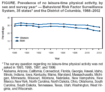 Persons using assistive technology might not be able to fully access information in this file. For assistance, please send e-mail to: mmwrq@cdc.gov. Type 508 Accommodation and the title of the report in the subject line of e-mail. Prevalence of No Leisure-Time Physical Activity --- 35 States and the District of Columbia, 1988--2002Physical inactivity is associated with obesity and increased risk for chronic diseases (e.g., cardiovascular disease, certain cancers, and diabetes mellitus) and premature mortality (1). A national health objective for 2010 is to reduce the prevalence of no leisure-time physical activity to 20% (objective 22.1) (2). Women, older adults, and the majority of racial/ethnic minority populations have the greatest prevalence of leisure-time physical inactivity (2). To examine trends in no leisure-time physical activity and further characterize them by sex, age group, and racial/ethnic population, CDC analyzed 1988--2002 data from the Behavioral Risk Factor Surveillance System (BRFSS) for 35 states* and the District of Columbia (DC). This report summarizes the results of that analysis, which indicated that leisure-time physical inactivity decreased during 1988--2002, especially after 1996, with declining trends among men and women, the majority of age groups, and the majority of racial/ ethnic populations. To promote further declines, state and local health departments and other organizations should adopt effective, evidence-based strategies to encourage more adults to be physically active in their leisure time. BRFSS is a state-based, random-digit--dialed telephone survey of the U.S. civilian, noninstitutionalized population aged >18 years. Data on leisure-time physical inactivity were collected from 11 surveys (conducted in 1988, 1989, 1990, 1991, 1992, 1994, 1996, 1998, 2000, 2001, and 2002). During 1988--2002, annual sample sizes increased from 54,685 to 170,423 persons. No leisure-time physical activity was defined as a "no" response to the survey question, "During the past month, other than your regular job, did you participate in any physical activities or exercise such as running, calisthenics, golf, gardening, or walking for exercise?" Although this survey question has been used since 1986, the wording of the reference time frame of the survey question was changed to "past 30 days" in 2001 and back to "past month" in 2002, and the phrase "other than your regular job" was added in 2001. Prevalence estimates by sex, age, and race/ethnicity were weighted to represent the populations of states included in the study, and sex and race/ethnicity estimates were age-adjusted to the 2000 U.S. population. The annual median response rate among the 35 states and DC ranged from 68.8% in 1993 to 59.9% in 2002. SUDAAN was used to account for complex sampling. Overall, the prevalence of no leisure-time physical activity peaked in 1989 at approximately 32% and was stable until 1996, after which it declined an average of 1% per year to 25% in 2002. By sex, the prevalence decreased from 29% to 22% among men and from 32% to 28% among women (Figure). By age group, no leisure-time physical activity was least prevalent among adults aged 18--29 years. During 1988--2002, prevalences in this age group ranged from 18%--21% among men and 24%--27% among women (Table 1); however, comparing 1988 survey results with those from 2002, the prevalences for men and women in that age group were unchanged. Since 1996, the prevalence of no leisure-time physical activity declined among all age groups, especially among persons in older groups. During 1988--2002, the prevalence of no leisure-time physical activity among persons aged 50--59 years decreased from 38% to 23% among men and from 35% to 28% among women. Among women aged 60--69 years, the prevalence of leisure-time physical inactivity decreased from 37% to 31%, and among women aged >70 years, the prevalence decreased from 47% to 39%. Among non-Hispanic whites, during 1988--2002, the prevalence of no leisure-time physical activity decreased from 28% to 19% among men and from 29% to 23% among women (Table 2). Among non-Hispanic blacks, the prevalence of no leisure-time physical activity decreased from 36% to 28% among men and from 47% to 36% among women. Among Hispanic men and women, prevalences for 1988 (37% and 40%, respectively) and 2002 (35% and 40%, respectively) were similar; yearly prevalences ranged from 34% to 42% among men and from 39% to 45% among women. Reported by: SA Ham, MS, MM Yore, MSPH, JE Fulton, PhD, HW Kohl III, PhD, Div of Nutrition and Physical Activity, National Center for Chronic Disease Prevention and Health Promotion, CDC. Editorial Note:The findings in this report indicate that, in 2002, the overall prevalence of no leisure-time physical activity in 35 states and DC was at the lowest level in 15 years. During 1988--2002, the overall prevalence declined approximately seven percentage points from its peak in 1989, including five percentage points since 1996. An estimated 8.3 million fewer adults reported being inactive in 2002 than in 1996. The causes are unknown for the overall decline in no leisure-time physical activity since 1996; however, the decline followed issuance of new national guidelines on physical activity in 1995 and 1996 (1,3). Findings through 1996 are consistent with a previous BRFSS trend analysis for 1990--1998 that indicated no change in prevalence (4), although prevalence during 1986--1990 declined (5). Analyses of National Health Interview Survey (NHIS) results show greater prevalence of no leisure-time physical activity than BRFSS and, since 1997, smaller declines (2%--3%) in multiple demographic groups (2). These variations might be due to differences in survey questions and sampling frames for the two surveillance systems. However, the majority of demographic groups measured by both BRFSS and NHIS have prevalences of no leisure-time activity greater than the 20% national health objective for 20