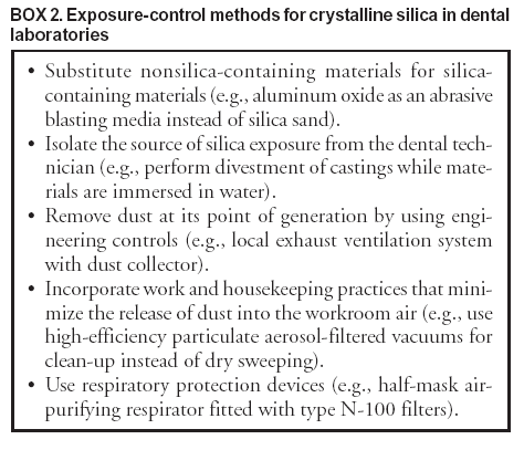 Persons using assistive technology might not be able to fully access information in this file. For assistance, please send e-mail to: mmwrq@cdc.gov. Type 508 Accommodation and the title of the report in the subject line of e-mail. Silicosis in Dental Laboratory Technicians --- Five States, 1994--2000Silicosis is a debilitating, sometimes fatal, yet preventable occupational lung disease caused by inhaling respirable crystalline silica dust. Although crystalline silica exposure and silicosis have been associated historically with work in mining, quarrying, sandblasting, masonry, founding, and ceramics, certain materials and processes used in dental laboratories also place technicians at risk for silicosis (1--3). During 1994--2000, occupational disease surveillance programs in five states identified nine confirmed cases of silicosis among persons who worked in dental laboratories; four persons resided in Michigan, two in New Jersey, and one each in Massachusetts, New York, and Ohio. This report describes three of the cases and underscores the need for employers of dental laboratory technicians to ensure appropriate control of worker exposure to crystalline silica. Silicosis cases in Michigan, New Jersey, and Ohio were identified through the Sentinel Event Notification Systems for Occupational Risks (SENSOR) surveillance program (4). The case in New York was identified through the state's Occupational Lung Disease Registry, and the case in Massachusetts was identified through the state's Occupational Disease and Injury Surveillance System; both use the SENSOR model. Although cases were identified during 1994--2000, diagnoses preceded state surveillance system identification. State surveillance programs identify suspected cases of silicosis through various sources, including hospital discharge data, death certificate data, workers' compensation reports, and physician reports. Cases are confirmed on the basis of the silicosis surveillance case definition (Box 1) adopted by these state surveillance programs and information from interviews, medical record review, or chest radiograph classification by a National Institute for Occupational Safety and Health (NIOSH)--certified B-reader*. Case ReportsCase 1. In November 1992, a man aged 65 years in New Jersey died 4 days after being admitted to a hospital with abdominal pain, nausea, and vomiting. The cause of death was shock, pancreatitis, and respiratory failure. At age 48 years, silicosis had been diagnosed in the patient. He had worked for 46 years in dental laboratories, 27 years as an owner, and had performed routine dental laboratory operations. He reportedly was exposed to dust, cobalt, and chemicals, and never wore a respirator. A B-reader classification of a chest radiograph taken 1 day before his death revealed small, rounded opacities involving the upper zones, with a profusion category of 1/2, consistent with silicosis. Case 2. In September 1995, silicosis was diagnosed in a man aged 66 years in New York. He had worked as a dental technician for 30 years and had been exposed to various mineral and metallic dusts. A chest radiograph taken at a local hospital revealed category 2/3 profusion of small, nodular opacities in the middle and lower lung zones, consistent with silicosis. Asbestosis and berylliosis also were diagnosed. Case 3. In November 1992, a man aged 67 years in New Jersey died 3 days after being admitted to a hospital with progressive confusion. The cause of death was urosepsis caused by scleroderma, anemia, and renal failure. He had worked for 28 years in dental laboratories, 24 years as an owner. He reportedly was exposed to various dusts, performed sandblasting in dental laboratories, and never wore a respirator. A chest radiograph taken 10 weeks before his death revealed small, rounded opacities involving the upper zones, with a profusion category of 3/2, consistent with silicosis. Reported by: KD Rosenman, MD, Michigan State Univ, East Lansing, Michigan. E Pechter, MPH, Massachusetts Dept of Public Health. DP Schill, MS, DJ Valiante, MS, EA Bresnitz, MD, New Jersey Dept of Health and Senior Svcs. KR Cummings, MPH, New York State Dept of Health. E Socie, MS, Ohio Dept of Health. MS Filios, ScM, Div of Respiratory Disease Studies, National Institute for Occupational Safety and Health, CDC. Editorial Note:The findings in this report suggest that dental laboratory technicians might be at risk for silicosis as a result of uncontrolled exposure to airborne crystalline silica dust. For the patients described in this report, the only identified source of crystalline silica exposure was their work as dental technicians. Exposure to respirable crystalline silica in dental laboratories can occur during procedures that generate airborne dust (e.g., mixing powders, removing castings from molds, grinding and polishing castings and porcelain, and using silica sand for abrasive blasting). The proportion of crystalline silica in mold and porcelain materials, by weight, can range up to 70%. A study of dental technicians in South Korea (6) that described materials and processes similar to those used in the United States found exposures during polishing operations that exceeded the NIOSH recommended exposure limit of 0.05 mg/m3 (7). The United States has approximately 14,000 dental laboratories (8), and approximately 6,400 dental laboratory technicians are certified by the National Association of Dental Laboratories (NADL) (NADL, unpublished data, 2004). Because dental laboratories are not registered or licensed, the actual number of dental laboratory technicians is unknown. The findings in this report are subject to at least three limitations. First, data for some variables (e.g., month or year of diagnosis and job history) were not available for all cases. Second, the risk for exposure to crystalline silica could not be quantified because data on exposure levels among dental laboratory technicians are limited. Finally, silicosis case as