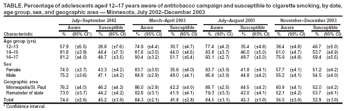 Persons using assistive technology might not be able to fully access information in this file. For assistance, please send e-mail to: mmwrq@cdc.gov. Type 508 Accommodation and the title of the report in the subject line of e-mail. Effect of Ending an Antitobacco Youth Campaign on Adolescent Susceptibility to Cigarette Smoking --- Minnesota, 2002--2003The majority of persons who become regular cigarette smokers begin smoking during adolescence. Comprehensive state antitobacco programs, especially those with strong advertising (i.e., paid media) campaigns, have contributed to the substantial decline in adolescent smoking since 1997 (1,2). In Minnesota, annual funding for tobacco-control programs was reduced from $23.7 million to $4.6 million in July 2003, ending the Target Market (TM) campaign directed at youths since 2000. To assess the effects of cutting the state's tobacco-control funding, during November--December 2003, the University of Miami School of Medicine surveyed Minnesota adolescents aged 12--17 years to determine their awareness of the TM campaign and their susceptibility to smoking. These data were compared with results from previous surveys. This report summarizes the results of that analysis, which indicated that the percentage of adolescents who were aware of the TM campaign declined from 84.5% during July--August 2003 to 56.5% during November--December 2003, and the percentage of adolescents susceptible to cigarette smoking increased from 43.3% to 52.9%. These findings underscore the need to maintain adequate funding of state antitobacco programs to prevent tobacco use among youths. Begun in 2000, the Minnesota TM campaign was organized around three components: a paid advertising campaign, a youth organization, and a website targeted to youth. Each component was branded with the TM logo. Data from four cross-sectional telephone surveys of Minnesota youths aged 12--17 years were used to measure the target audience's awareness of the campaign and the impact of the campaign on susceptibility to smoking. The four surveys were conducted during July--September 2002, March--April 2003, July--August 2003, and November--December 2003. A $10 department store gift card was used as an incentive to participate, and parental permission was required. Response rates for the four surveys ranged from 73.2% to 76.1%, and sample sizes ranged from 1,079 to 1,150. The demographic distribution of each sample, according to 2000 U.S. census data, was similar to that of the adolescent population in Minnesota by age group, sex, race/ethnicity, and geographic region (i.e., Minneapolis/St. Paul metropolitan area versus the rest of the state) (3). Confirmed campaign awareness was defined as awareness of the TM brand logo, as indicated by responses to the statement, "When you see the capital letters `TM' inside of a circle, tell me what you think of." To confirm brand awareness, survey participants had to provide responses that were specific to the TM brand message (e.g., linking specific campaign components to campaign objectives, the brand logo with a major message theme, or acknowledging TM as an organized movement). Overly general responses, such as "Don't smoke," were not counted as confirmed awareness. To determine susceptibility to cigarette smoking (4,5), participants were asked to respond to the statement, "You will smoke a cigarette in the next year." Susceptibility was defined as any response other than "strongly disagree." The same statements and response categories for confirmed campaign awareness and susceptibility to smoking were used for all four surveys. Findings from surveys conducted during July--September 2002 (2 years after the campaign began), March--April 2003, and July--August 2003 indicated an increase in confirmed campaign awareness from 74.6% to 84.5%, with a plateau observed between the second and third surveys. The youth campaign was ended in July 2003, and a statistically significant decline to 56.5% occurred in confirmed awareness between the surveys conducted during July--August 2003 and November--December 2003 (Figure). Similar patterns for campaign awareness were observed by age group, sex, and geographic area (Table). In addition, between the July--August 2003 and November--December 2003 surveys, a corresponding statistically significant increase in susceptibility to smoking, from 43.3% to 52.9%, occurred among Minnesota adolescents (Figure). Susceptibility to smoking increased in all age groups, both sexes, and by geographic area. Reported by: D Sly, PhD, K Arheart, EdD, N Dietz, PhD, Univ of Miami School of Medicine, Florida. C Borgen, MBA, Minnesota Dept of Health. E Trapido, SciD, Div of Cancer Control and Population Sciences, National Cancer Institute. D Nelson, MD, J McKenna, MS, Office on Smoking and Health, National Center for Chronic Disease Prevention and Health Promotion, CDC. Editorial Note:The findings in this report demonstrate the impact on awareness of elimination of a Minnesota youth antitobacco campaign 6 months after that campaign ended and suggest that state cutbacks in antitobacco campaigns might increase the susceptibility of youths to smoking, which is a key predictor of adolescent tobacco use (4,5). These findings are consistent with data from a previous study in Massachusetts that documented an increase in illegal tobacco sales to minors after funding cuts to that state's antitobacco program (6). These findings are of particular concern in states where antitobacco efforts have been cut substantially. For example, programs in Massachusetts and Florida included paid media campaigns and substantial youth components before funding declined 92% and 99%, respectively, from peak levels (7). The prevalence of smoking among youths has declined most rapidly in states that have used the most extensive paid media campaigns in combination with other antitobacco activities (8). For example, after a comprehensive program with an extensive paid media campaig