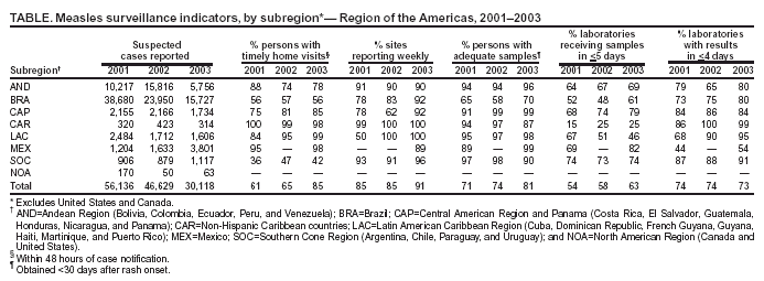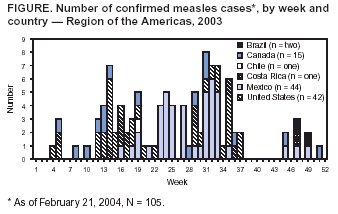 Persons using assistive technology might not be able to fully access information in this file. For assistance, please send e-mail to: mmwrq@cdc.gov. Type 508 Accommodation and the title of the report in the subject line of e-mail. Progress Toward Measles Elimination --- Region of the Americas, 2002--2003In 1994, countries in the Region of the Americas adopted the goal of eliminating endemic measles transmission* in the Western hemisphere by 2000 (2). Since 1994, rapid progress has been made. The number of measles cases has declined >99%, from approximately 250,000 in 1990 to 105 confirmed cases reported in six countries in 2003. During 2003, only Mexico and the United States reported outbreaks. The three chains of transmission in Mexico and two U.S. outbreaks were import-related (3); a third U.S. outbreak was of unknown source. Since November 2002, no transmission of the D6 and D9 genotypes has been reported; these genotypes were responsible for several large outbreaks in the region during 1997--2002 (4). This report summarizes the epidemiology of measles in the Americas during 2002--2003 and highlights progress toward measles elimination, including the lowest ever number of reported measles cases in the region. Because the region is under constant threat of measles importation from regions where the disease is endemic, countries must maintain high population immunity to measles and sensitive surveillance to ensure the timely detection of imported cases and allow for rapid implementation of control measures. Vaccination ActivitiesKey vaccination activities in the measles-elimination initiative include implementing the Pan American Health Organization (PAHO)'s recommended vaccination strategies§ or attaining >95% routine vaccination coverage with 2 doses of measles-containing vaccine (MCV) (5). Special efforts in the region have focused on identifying and increasing vaccination levels in districts at high risk because of high population density, high rural-to-urban migration, presence of indigenous populations and tourism, populous border regions, areas with low vaccination coverage, and areas with poor surveillance or poor access to health services. The most important of these activities were nationwide supplemental immunization activities (SIAs); 10 of these were conducted in 2002. The estimated number of children vaccinated against measles in SIAs was 10.4 million in 2000; 10.6 million in 2001; and 9.9 million in 2002. Reported routine measles vaccination coverage for the region¶ was 94% in 2000, 96% in 2001, and 92% in 2002. In 2002, reported routine coverage ranged from 51% in the Latin American/Caribbean subregion to 99% in the Southern Cone subregion (i.e., Argentina, Chile, Paraguay, and Uruguay). Coverage of >90% was reported by 28 countries; 12 reported coverage of <90%. The percentage of children living in municipalities with routine coverage of >95% was 55% in 2000, 59% in 2001, and 50% in 2002**. Measles SurveillanceDuring 2002--2003, the number of suspected measles and rubella cases (defined as a febrile rash illness or any case for which a health-care provider suspects measles or rubella) notified to national surveillance systems decreased from 46,629 to 30,118 (Table). The proportion of suspected cases with a timely home visit for case investigation increased from 65% in 2002 to 85% in 2003. During 2002--2003, the proportion of persons with suspected measles with adequate specimens taken for laboratory diagnosis increased from 74% to 81%, and the proportion of notification sites sending weekly reports increased from 85% to 91%. The rate of notification of febrile rash illnesses that are not measles, rubella, or dengue declined from 6.7 per 100,000 population in 2001, to 6.2 in 2002, and to 4.6 in 2003. Measles Epidemiology, 2002--2003In 2002, a total of 2,584 confirmed measles cases were reported in the Americas. Of these, 2,397 occurred during an outbreak in Venezuela after an importation of a D9 measles virus from Europe (6,7). The outbreak affected 16 (67%) of the 24 states in Venezuela. The age groups most affected were children aged <1 year (120 cases per 100,000 population). This outbreak spread to Colombia, where 139 cases were reported. The last confirmed measles case in these outbreaks, and the last case attributed to the D9 virus in the Americas, occurred in Venezuela in November 2002. In 2002, an additional 44 confirmed cases were reported in the United States, six were reported in Canada, and one was reported in Brazil. In 2003, a total of 105 confirmed measles cases were reported in the Americas, the lowest number ever reported in the region. Of these, one occurred in Chile, one in Costa Rica, two in Brazil, 15 in Canada, 42 in the United States, and 44 in Mexico (Figure). The case in Chile occurred in a man aged 33 years who had rash onset on March 28 after travel to Japan. The case in Costa Rica occurred in a man aged 38 years who had rash onset on November 17 after returning from travel to India. In Brazil, the first case occurred in a man aged 34 years who had rash onset on November 21 after travel to Germany, England, and Holland. The second case occurred in a child aged 11 months of the initial patient, with symptom onset on December 1. The 15 cases in Canada were all imported§§. Of 42 U.S. cases, 33 were imported or linked to an importation; the remaining nine cases were of unknown origin¶¶. During 2003, Mexico reported three chains of transmission, with a total of 44 confirmed measles cases occurring in 17 municipalities. In 41 cases, rash onset occurred during April 13--August 25. Subsequently, three cases were detected with rash onset in November and early December. Of the 44 confirmed cases, 14 occurred in infants aged <1 year and 12 in adults aged 20--29 years; 42 patients were unvaccinated. The first chain of 22 cases had rash onset during April 13--July 4, the second chain of 19 cases had rash onset during July 22--August 25, and the last c