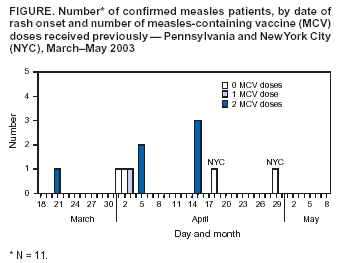 Persons using assistive technology might not be able to fully access information in this file. For assistance, please send e-mail to: mmwrq@cdc.gov. Type 508 Accommodation and the title of the report in the subject line of e-mail. Measles Outbreak in a Boarding School --- Pennsylvania, 2003Measles has not been endemic in the United States since 1997, although limited outbreaks continue to be caused by imported* cases (1,2). In 2003, CDC assisted in investigating the largest school outbreak of measles in the United States since 1998 (3). The outbreak consisted of 11 laboratory-confirmed cases: nine cases in a boarding school in eastern Pennsylvania and two epidemiologically linked cases in New York City (NYC). This report summarizes the results of the outbreak investigation, which indicated that measles continues to be imported into the United States and that high coverage with 2 doses of measles-containing vaccine (MCV) among students was effective in limiting the size of the outbreak. Health-care providers should maintain a high index of suspicion for measles, especially in those who have traveled abroad recently, and recommendations for 2 doses of MCV in all school-aged children should be followed. In April 2003, the Pennsylvania Department of Health reported to CDC two cases of measles in unvaccinated twins aged 13 years in a boarding school with 663 students. Active surveillance for measles was conducted in the school, hospitals, and doctors' offices through May 2003. Patients were interviewed, acute- and convalescent-phase sera were collected for measles IgM enzyme-linked immunosorbent assay testing, and throat swabs and urine samples were collected for viral genotyping. Efforts to control the outbreak included vaccinating or excluding from campus and isolating all students and staff members with no evidence of immunity to measles§. School and personal vaccination records were reviewed to identify susceptible students and staff members, respectively. For evaluation of vaccine effectiveness, only students enrolled in the school at the beginning of the outbreak were included. All staff members and those students who received measles vaccination during the outbreak were excluded. Vaccine effectiveness (VE) was calculated as VE (%) = [(ARU - ARV) / ARU] x 100, where ARU is the attack rate in unvaccinated persons and ARV is the attack rate in students who had received 2 doses of MCV previously (4). A total of 11 laboratory-confirmed cases of measles were identified. The source patient was a student aged 17 years who had received 2 doses of MCV. On March 15, 2003, the student had returned to the United States from Beirut, Lebanon, where measles was known to be circulating. He had cough and fever the following day and rash on March 21, when he visited an emergency department and was diagnosed with a viral exanthem. Upon returning to school, the patient stayed at the school health center before returning to his dormitory. Five persons with laboratory-confirmed measles were linked epidemiologically to the source patient. These five included the unvaccinated twins who lived in the same dormitory, the dormitory houseparent, and two other students in different dormitories. One of these latter students infected two additional students in his dormitory and an unvaccinated child aged 13 months in NYC, who was linked epidemiologically to an unvaccinated immigrant aged 33 years, who was diagnosed with measles and who lived in the same apartment building. The ninth school patient was linked epidemiologically to, and might have been infected by, any one of five infected persons from different dormitories. All nine measles cases in the school were confirmed serologically. Measles genotype D4 was identified in two school patients and the child in NYC. The last date of rash onset in a boarding school patient was April 15 (Figure). No deaths or major complications were reported; two students with measles, who were unvaccinated because of religious exemptions, required hospitalization for dehydration. The median age of the nine patients in the school was 17 years (range: 13--26 years). Of the nine, two had not received any doses of MCV, one had received 1 dose, and six had received 2 doses. Patients with 1 or 2 doses of MCV had milder illness than unvaccinated patients, including a shorter duration of rash (median: 5 days versus 10 days; p<0.05) and fewer days of school or work missed (median: 5 days versus 8 days; p<0.05) (Table). Of the 663 students in the boarding school, eight (1.2%) students had never received any doses of MCV, 26 (3.9%) students had received 1 dose, and 629 (94.9%) students had received 2 doses before the outbreak. Thus, vaccine coverage for 2 doses was 94.9% and for >1 dose was 98.8%. Vaccination with measles, mumps, and rubella vaccine was begun on April 3. Of the eight unvaccinated students, four had claimed religious or philosophical exemptions. Of these four students, two contracted measles, one was excluded from the school, and one was vaccinated during the outbreak. All of the remaining four unvaccinated students who did not claim any exemptions were vaccinated during the outbreak as well as other susceptible students and staff members. Excluding five previously unvaccinated students who were vaccinated during the outbreak and two students who had 2 doses of MCV previously but were inadvertently revaccinated during the outbreak, the measles attack rate was 66.7% (two of three) among unvaccinated students and 1.0% (six of 627) among students who had received 2 doses of MCV. All vaccinees with 1 dose of MCV received a second dose during the outbreak; no measles cases were diagnosed among these students. VE was 98.6% among students who had received 2 doses of MCV. Reported by: P Lurie, MD, P Britz, J Bowen, P Tran, MEd, H Stafford, Pennsylvania Dept of Health. YA Gillan, DrPH, New York City Dept of Health and Mental Hygiene. W Bellini, PhD, P Rota, PhD, J Rota, MPH, Div of Viral