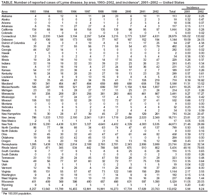 Persons using assistive technology might not be able to fully access information in this file. For assistance, please send e-mail to: mmwrq@cdc.gov. Type 508 Accommodation and the title of the report in the subject line of e-mail. Lyme Disease --- United States, 2001--2002Lyme disease (LD) is caused by the spirochete Borrelia burgdorferi and is transmitted through the bite of Ixodes spp. ticks. CDC began LD surveillance in 1982, and the Council of State and Territorial Epidemiologists designated LD a nationally notifiable disease in 1991. This report summarizes the analysis of 40,792 cases of LD reported to CDC during 2001--2002. The results of that analysis indicate that annual LD incidence increased 40% during this period. The continued emergence of LD underscores the need for persons in areas where LD is endemic to reduce their risk for infection through integrated pest management, landscaping practices, repellent use, and prompt removal of ticks. For surveillance purposes, a case of LD is defined as physician-diagnosed erythema migrans (EM) >5 cm in diameter or at least one objective manifestation of late LD (e.g., musculoskeletal, cardiovascular, or neurologic) with laboratory confirmation of B. burgdorferi infection using a two-tiered assay (1). National, state, and age-specific incidence was calculated by using U.S. Census Bureau data for 2001 and 2002; incidence by county was calculated by using U.S. Census data for 2000. In 2001, a total of 17,029 cases of LD were reported to CDC by 43 states and the District of Columbia, yielding a national incidence of 6.0 cases per 100,000 population. In 2002, the number of reported cases increased 40% to 23,763 cases, yielding a national incidence of 8.2 cases per 100,000 population (Table, Figure 1). All states except Hawaii, Montana, and Oklahoma reported cases during 2002. Twelve states reported an incidence of LD that was higher than the national average in both 2001 and 2002: Connecticut, Delaware, Maine, Maryland, Massachusetts, Minnesota, New Hampshire, New Jersey, New York, Pennsylvania, Rhode Island, and Wisconsin. These 12 states account for 95% of cases reported nationally (Table, Figure 2). During 2000--2001, LD case reports increased in 15 states, decreased in 26 states, and remained the same in nine states. During 2001--2002, LD case reports increased in 39 states, decreased in seven states, and remained the same in four states. Only one state, Arkansas, reported a decrease for both 2001 and 2002. Counties reporting >15 cases accounted for >90% of all cases reported in both years. During 2001--2002, the number of counties reporting >15 cases increased from 123 to 151. In 2001, a total of 35 counties in seven states (Connecticut, Delaware, Massachusetts, New Jersey, New York, Pennsylvania, and Rhode Island) reported >100 cases. In 2002, a total of 53 counties in 10 states (i.e., the seven states from 2001 plus Maine, Minnesota, and New Hampshire) reported >100 cases. For both 2001 and 2002, the highest incidence of LD was reported from Columbia County, New York, with 1,026 and 1,583 cases per 100,000 population, respectively. Combining data for both years, information on patient age and sex was available for 99% of patients. Patient ages ranged from <1 to 101 years and followed a bimodal distribution, with incidence peaks among children aged 5--14 years (9.9 cases per 100,000 population per year) and adults aged 50--59 years (9.2 cases per 100,000 population per year). Overall, 21,525 (53%) of 40,440 patients were male. Demographic features differed for states with above- and below-average incidence. Among 12 states with above-average incidence, the modal age of patients was 6 years; 54% were males. Among 38 states with below-average incidence, the modal age of patients was 44 years; 47% were males. A total of 83% of reports for 2001 and 2002 had a date of illness onset provided. Patients were most likely to have illness in May (7%), June (28%), July (31%), or August (12%). Fewer than 7% were reported to have illness onset during December--March. Among 31,120 patients for whom at least one clinical finding was indicated, a history of EM was reported for 21,126 (68%) patients, arthritis for 10,126 (33%) patients, Bell's palsy for 2,510 (8%) patients, and radiculopathy for 1,009 (3%) patients. Meningitis, encephalitis, and heart block were reported in <1% of patients. Reported by: State and District of Columbia health departments. RM Bacon, MS, PS Mead, MD, JL Kool, MD, AS Postema, MPH, Div of Vector-Borne Infectious Diseases, National Center for Infectious Diseases; JE Staples, MD, EIS Officer, CDC. Editorial Note:During 2002, a total of 23,763 LD cases were reported to CDC, more than in any previous year. Analysis of 2001 and 2002 data indicates that, as in previous years, most cases occur in northeastern, mid-Atlantic, and north central states, and the largest proportion of cases are reported among persons aged 5--14 years and 50--59 years. Factors potentially contributing to the increase in reported cases include growing populations of deer that support the Ixodes tick vector, increased residential development of wooded areas, tick dispersal to new areas, improved disease recognition in areas where LD is endemic, and enhanced reporting. Surveillance for LD is subject to several limitations. Studies from the early 1990s suggested that LD cases were underreported by six to 12-fold in some areas where LD is endemic (2,3); the current degree of underreporting for national data is unknown. In addition, differences in the demographics of reported cases among states with above- and below-average incidence suggest variation in diagnostic and reporting practices among states. Clinicians are reminded that the LD case definition was developed for surveillance purposes and might not be appropriate for clinical management of individual patients (1). In February 2002, the only Food and Drug Administration--approved LD vaccine for humans was
