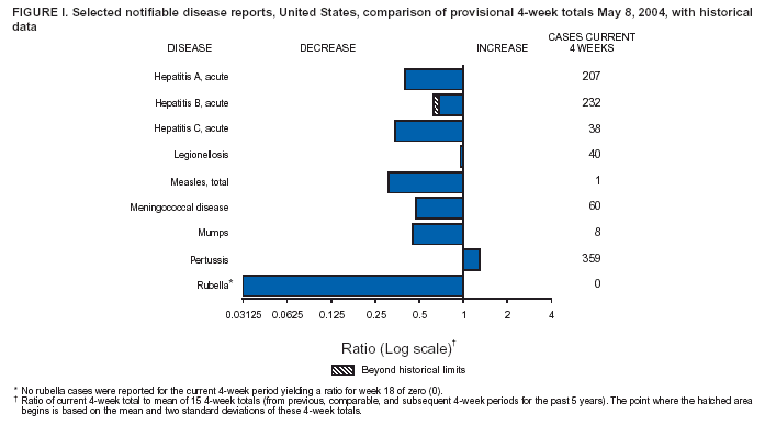 Persons using assistive technology might not be able to fully access information in this file. For assistance, please send e-mail to: mmwrq@cdc.gov. Type 508 Accommodation and the title of the report in the subject line of e-mail. Notifiable Diseases/Deaths in Selected Cities Weekly InformationFigure I Selected notifiable disease reports, United States, comparison of provisional 4-week totals ending May 8, 2004, with historical data Table I Summary of provisional cases of selected notifiable diseases, United States, cumulative, week ending May 8, 2004 (18th Week) Table II Provisional cases of selected notifiable diseases, United States, weeks ending May 8, 2004 and May 3, 2003 (18th Week) Table III Deaths in 122 U.S. cities, week ending May 8, 2004 (18th Week) Figure I ![]() Return to top. Table I ![]() Return to top. Table II