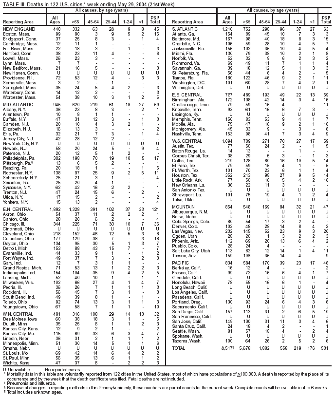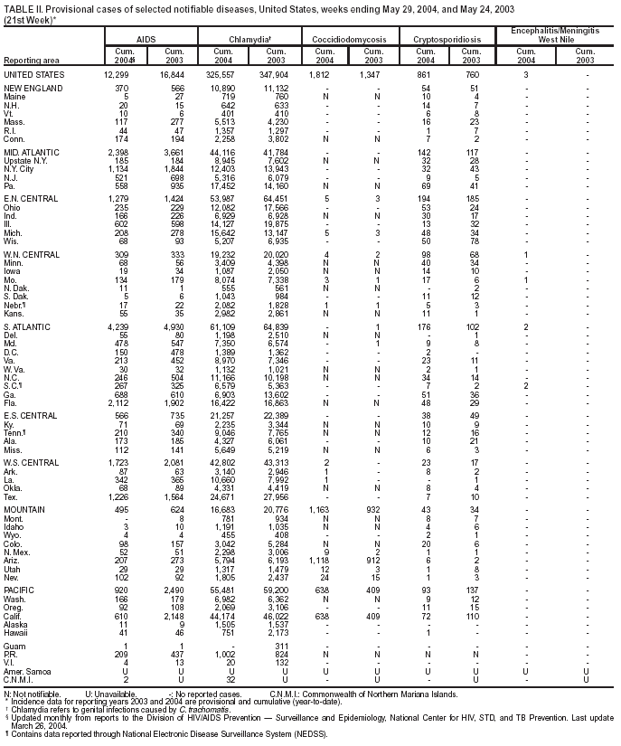 Persons using assistive technology might not be able to fully access information in this file. For assistance, please send e-mail to: mmwrq@cdc.gov. Type 508 Accommodation and the title of the report in the subject line of e-mail. Notifiable Diseases/Deaths in Selected Cities Weekly InformationFigure I Selected notifiable disease reports, United States, comparison of provisional 4-week totals ending May 29, 2004, with historical data Table I Summary of provisional cases of selected notifiable diseases, United States, cumulative, week ending May 29, 2004 (21st Week) Table II Provisional cases of selected notifiable diseases, United States, weeks ending May 29, 2004 and May 24, 2003 (21st Week) Table III Deaths in 122 U.S. cities, week ending May 29, 2004 (21st Week) Figure I ![]() Return to top. Table I ![]() Return to top. Table II