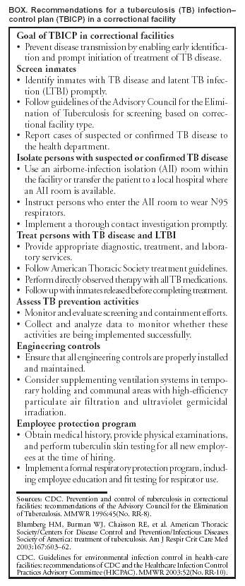 Persons using assistive technology might not be able to fully access information in this file. For assistance, please send e-mail to: mmwrq@cdc.gov. Type 508 Accommodation and the title of the report in the subject line of e-mail. Tuberculosis Transmission in Multiple Correctional Facilities --- Kansas, 2002--2003Tuberculosis (TB) is a substantial health concern in correctional facilities; inmates and employees are at high risk, and TB outbreaks can lead to transmission in surrounding communities (1--3). The Advisory Council for the Elimination of Tuberculosis (ACET) recommends that all correctional facilities have a written TB infection--control plan (TBICP) (4). In September 2002, after diagnosis of smear-positive pulmonary TB in a prison inmate, the Kansas TB Control Program, with assistance from CDC, initiated a 6-month contact investigation. This report summarizes the results of that investigation, which determined that, while symptomatic for TB, the inmate had resided in three different jails and a state prison, placing hundreds of employees and other inmates at risk for TB infection. The circumstances of this case underscore the need for effective TBICPs to be implemented by trained employees in jails and prisons and for establishment of mechanisms to facilitate information-sharing between correctional facilities and local and state health departments. Case ReportIn October 2001, a U.S.-born man aged 36 years who was living temporarily in a California homeless shelter had a productive cough with hemoptysis. In December 2001, a physician at the shelter examined the man, suspected TB or neoplasia, and recommended a chest radiograph; however, the man did not follow the recommendation. In January 2002, the man returned to his residence in Kansas. Shortly after arrival, he turned himself in to police on an outstanding arrest warrant. He was held in jail A for 3 days before being transferred to jail B. While in jail B, he received a medical evaluation, and bronchial asthma was diagnosed. A tuberculin skin test (TST) was not administered, nor was a chest radiograph obtained. After 7 weeks in jail B, the man was released in March 2002. In June 2002, the man was convicted of a crime and again placed in jail A for 3 days. He was then transferred to jail C, a large overflow facility, pending sentencing. During the 6 weeks the man was in jail C, 125 transferred inmates passed through the facility. In August 2002, after being held for a total of 14 weeks in three jails, none of which had a TBICP or had provided TB screening for inmates or employees, the man was sentenced and transported to a Kansas state prison. During routine processing of entering inmates, he answered affirmatively to six of seven questions regarding TB symptoms. The state prison had a TBICP in place, and a medical evaluation was indicated on the basis of the man's answers; however, he was not referred for medical evaluation. Following the prison's TBICP procedure for entering prisoners who are to be serially TB screened, medical staff performed a two-step TST, which was read as 0 mm induration on both occasions. The new inmate was then placed among the general prison population. Medical staff at the state prison did not see the inmate again until 4 weeks later, when he was scheduled to receive chronic care for asthma. At this medical examination, he received a chest radiograph that showed a cavitary lesion of the right lower lobe. Despite having TB symptoms, he was placed back with the general prison population and scheduled for a computerized tomography (CT) scan 2 weeks later to rule out neoplasia. After the CT scan indicated cavitary lesions consistent with TB, the man, now the TB index patient, was placed in airborne infection isolation (AII), and sputum samples were collected. The AII room was newly constructed and in working condition, according to maintenance and monitoring documentation. However, because the recommended N95 respirators (5) were not available, prison health staff used surgical masks when in the AII room with the index patient. The first laboratory result from the index patient of 4+ smear-positive Mycobacterium tuberculosis was reported in late September, 6 weeks after he had arrived at the prison facility. Contact InvestigationA contact investigation conducted in Kansas and Missouri identified 318 of an estimated 800 possible contacts of the index patient during the infectious period, defined as the time from symptom onset to diagnosis, October 2001--September 2002. Of these contacts, two (0.6%) received a diagnosis of TB disease. These two patients had been cellmates of the index patient, one in jail A and the other in jail C. Tests of samples from these patients and the index patient determined they had M. tuberculosis isolates with a matching 10-band restriction fragment-length polymorphism pattern. The three isolates also had matching spacer oligonucleotide typing and mycobacterial interspersed repetitive unit patterns. Of 318 contacts identified, 256 were tested, and 47 (19.1%) of those received diagnoses of latent TB infection (LTBI); 60 contacts could not be located or refused follow-up. Two (4.1%) had a previously documented positive TST. Sixty (23.4%) contacts had a previously documented negative TST, and six (10.0%) of these had a positive TST during investigation screening. Among 196 contacts with no previously documented TST, 41 (20.9%) had a positive TST during the investigation screening (Table). The majority of infections among jail and prison employees occurred in jail B (TST reaction rate: eight of 36 [22.2%]) and jail C (TST reaction rate: five of 32 [15.6%]), compared with jail A (TST reaction rate: one of 14 [7.1%]) and the state prison (TST reaction rate: one of 58 [1.7%]). All three jails had an open-cell design with multiple inmates per cell; the state prison had single-occupancy cells with solid walls and doors. Reported by: P Griffin, D McClenahan, J VandeVelde, Kansas Tuber