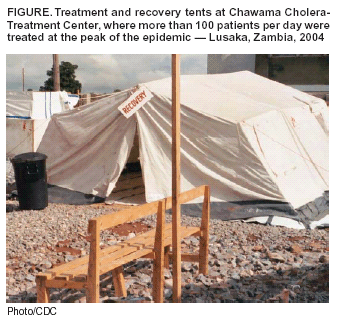 Persons using assistive technology might not be able to fully access information in this file. For assistance, please send e-mail to: mmwrq@cdc.gov. Type 508 Accommodation and the title of the report in the subject line of e-mail. Cholera Epidemic Associated with Raw Vegetables --- Lusaka, Zambia, 2003--2004Zambia experienced widespread cholera epidemics in 1991 (13,154 cases), 1992 (11,659), and 1999 (11,327) (1). In response to the large outbreak in 1999, the Zambian Ministry of Health (ZMOH) urged use of in-home chlorination with the locally produced solution, Clorin®, and the practice increased substantially Clorin® had been introduced in Zambia in 1998 as part of the Safe Water System (SWS), a point-of-use water disinfection and safe-water storage strategy* launched by the Society for Family Health, in partnership with ZMOH, the U.S. Agency for International Development, and CDC. Although no outbreaks were reported during 2000--2002, cholera remained endemic. Epidemic cholera returned to Zambia in November 2003, when cases of toxigenic Vibrio cholerae O1, serotype Ogawa, biotype El Tor were confirmed in the capital city, Lusaka. During November 28, 2003--January 4, 2004, an estimated 2,529 cholera cases and 128 cholera deaths (case-fatality rate [CFR] = 5.1%) occurred in Lusaka. In February 2004, the Lusaka District Health Management Team (LDHMT) invited CDC to assist in an investigation of the epidemic. This report summarizes the results of that investigation, which implicated foodborne transmission via raw vegetables and demonstrated a protective role for hand washing with soap. The results underscore the importance of hygiene, clean water, and sanitary food handling for cholera prevention. In response to increasing cases, Zambian authorities began opening designated cholera-treatment centers (CTCs) in Lusaka in December 2003. All seven CTCs were functional by early January 2004, and all patients with suspected cholera were referred to these facilities. During January 5--March 1, an additional 2,101 cases and 25 deaths from cholera (CFR = 1.2%) were recorded at CTCs in Lusaka. Investigators conducted a matched case-control study to identify risk factors for cholera. A case was defined as watery diarrhea in a person aged >5 years, who was admitted to the Chawama (Figure) or Kanyama CTC during February 11--22. Stool cultures were performed for all eligible patients. Homes of enrolled patients were visited, and one age-, sex-, and neighborhood-matched control per case was selected systematically from neighboring households. A total of 71 case-control pairs were enrolled in the study. V. cholerae O1 was identified in stool cultures from 52 (74%) patients. Both bivariate and multivariate analyses were performed, comparing all cases with culture-confirmed cases; because data were comparable for the two groups, results are reported for all cases in aggregate. The median age of patients was 27 years (range: 5--75 years); 58% were male. Common symptoms, in addition to diarrhea, included vomiting (61 [86%]) and leg cramps (44 [62%]). Bivariate analysis indicated that consumption of raw vegetables was associated with cholera (matched odds ratio [MOR] = 3.9; 95% confidence interval [CI] = 1.7--9.6; p = 0.0004). Hand soap was observed in 41 (58%) case homes and 64 (90%) control homes. Presence of hand soap was considered a proxy for actual hand washing and was determined to be protective (MOR = 0.14; 95% CI = 0.05--0.40; p = 0.0001). Consumption of kapenta, a local sardine-like dietary staple, also was protective (MOR = 0.35; 95% CI = 0.2--0.8; p = 0.005). Drinking untreated water was reported by 48 (67%) case-patients and 37 (52%) controls, but the association with disease did not reach statistical significance (MOR = 1.9; 95% CI = 0.9--3.9; p = 0.06). In-home chlorination of drinking water with Clorin® was reported by 48 (67%) controls and 47 (66%) case-patients. Free chlorine residuals were detected in stored water in 19 (27%) case homes and 14 (20%) control homes (MOR = 1.5; 95% CI = 0.7--3.3; p = 0.21). Kapenta, raw vegetables, presence of soap, and in-home water treatment were included in a multivariate model. Water treatment, either by boiling or home chlorination, was not significantly protective. Consumption of raw vegetables remained significantly associated with cholera (adjusted odds ratio [AOR] = 4.7; 95% CI = 1.7--13.0). The presence of hand soap remained significantly protective against cholera (AOR = 0.1; 95% CI = 0.04--0.40), as did consumption of kapenta (AOR = 0.3; 95% CI = 0.1--0.7). On the basis of these results, the Zambian Central Board of Health and LDHMT enhanced cholera-prevention efforts by reinforcing hand-washing promotion messages and recommending that vegetables be cooked or washed in treated water. Plans were created to improve hygiene and increase availability of latrines at Lusaka's major market to minimize cross-contamination of produce. Long-term prevention measures under discussion by local authorities include improving the quality and quantity of municipal water supplies. In April, cholera cases declined dramatically, and LDHMT closed the CTCs. Reported by: M Sinkala, MD, M Makasa, MD, F Mwanza, P Mulenga, Lusaka District Health Management Team, Zambia. P Kalluri, MD, R Quick, MD, E Mintz, MD, RM Hoekstra, PhD, Div of Bacterial and Mycotic Diseases, National Center for Infectious Diseases; A DuBois, MD, EIS Officer, CDC. Editorial Note:This month marks the 150th anniversary of the removal of the famed Broad Street pump handle after John Snow's classic study of epidemic cholera in London. Cholera is caused by toxigenic V. cholerae, serogroup O1 or O139. Infection can result in rapidly progressive, profuse, dehydrating diarrhea, with CFRs >22% when treatment is delayed (2). Cholera, which is still propagated by many of the same vehicles described by John Snow in the mid-1800s (3), remains a public health threat in sub-Saharan Africa and certain Asian coun