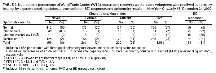 Persons using assistive technology might not be able to fully access information in this file. For assistance, please send e-mail to: mmwrq@cdc.gov. Type 508 Accommodation and the title of the report in the subject line of e-mail. Physical Health Status of World Trade Center Rescue and Recovery Workers and Volunteers --- New York City, July 2002--August 2004In the months after the September 11, 2001, attacks on the World Trade Center (WTC), concerns grew about the health consequences of exposures sustained by persons involved in the rescue and recovery response. In addition to the estimated 10,000 Fire Department of New York (FDNY) personnel, an estimated 30,000 other workers and volunteers potentially were exposed to numerous psychological stressors, environmental toxins, and other physical hazards. These concerns prompted CDC's National Institute for Occupational Safety and Health (NIOSH) to support the WTC Worker and Volunteer Medical Screening Program, which provided free, standardized medical assessments, clinical referrals, and occupational health education for workers and volunteers exposed to hazards during the WTC rescue and recovery effort. During July 16, 2002--August 6, 2004, the program evaluated 11,768 non-FDNY workers and volunteers. This report summarizes data analyzed from a subset of 1,138 of the 11,768 participants evaluated at Mount Sinai School of Medicine during July 16--December 31, 2002. These data indicated that a substantial proportion of participants experienced new-onset or worsened preexisting lower and upper respiratory symptoms, with frequent persistence of symptoms for months after their WTC response work stopped. These findings underscore the need for comprehensive health assessment and treatment for workers and volunteers participating in rescue and recovery efforts. The clinical program included a single screening evaluation consisting of medical- and exposure-assessment questionnaires, physical examination, pre- and post-bronchodilator (BD) spirometry, complete blood count, blood chemistries, urinalysis, chest radiograph, and mental health screening questionnaires. Participants were recruited through outreach that included community and union meetings, mailings, and articles in the media. Eligibility for the screening program was based on arrival date and duration of exposure to the site* rather than on symptomatology. Institutional review board approval and informed consent were obtained for data aggregation and analyses. The subset of 1,138 program participants was predominantly male (91%) and non-Hispanic white (58%), with a median age of 41 years (range: 21--74 years). Non-Hispanic blacks and Hispanics accounted for 11% and 15% of the population, respectively. The largest occupational sectors represented in this sample were technical and utilities (25%), law enforcement (21%), and construction (18%). Numerous other occupational groups accounted for the remaining 36%; 89% were union members. Of the 1,138 participants, 525 (46%) worked on WTC rescue and recovery efforts on September 11, 2001, and 963 (84%) worked or volunteered during September 11--14, when exposures were greatest. During that period, a total of 239 (21%) participants reported using appropriate respiratory protection (i.e., full- or half-face respirators) (1). The median length of time worked on the WTC effort was 966 hours (range 24--4,080 hours). Of the 610 examinees present in lower Manhattan on September 11, a total of 313 (51%) reported being directly in the cloud of dust created by the collapse of the WTC buildings, and an additional 191 (31%) reported exposure to substantial amounts of dust. A participant was considered to have a WTC-related symptom if the symptom either first developed (incident) or worsened (exacerbated) while working or volunteering on the WTC effort. WTC-related lower respiratory symptoms were reported by 682 (60%) of the sample, and 836 (74%) reported WTC-related upper respiratory symptoms. A total of 450 (40%) examinees had WTC-incident lower respiratory symptoms that persisted to the month before screening, and 565 (50%) reported WTC-incident and persistent upper respiratory symptoms (Table 1). Among the 851 participants who reported persistent WTC-related symptoms, an average of 32 weeks (range: 7--63 weeks) had elapsed since either they stopped working at the site or since the end of May 2002, when site cleanup was officially completed. On examination, 527 (46%) had nasal mucosal inflammation. Other respiratory abnormalities (e.g., abnormal nasal turbinates or sinuses, rhonchi, and wheezing) were less common. All participants underwent spirometry before and after an inhaled BD using standard techniques (2). A total of 360 (33%) participants had abnormal spirometry findings (Table 2), primarily because of results suggesting restriction; 84 (23%) had a significant§ post-BD response. A total of 22 (27%) of those with airway obstruction had a significant BD response consistent with asthma. Compared with a general population sample of employed, adult, white males (National Health and Nutrition Examination Surveys [NHANES III]) (3), the 599 participants who had never smoked had a higher prevalence of abnormalities on spirometry (31% versus 13%), which was attributable to a higher prevalence of restriction (21% versus 4%). Participants experienced numerous other symptoms (Table 3), including a substantial proportion with incident and persistent musculoskeletal symptoms, such as low back pain (16%) and upper or lower extremity pain (16% and 13%, respectively). Other incident and persistent symptoms included heartburn (15%), eye irritation (14%), and frequent headache (13%). Overall, 364 (23%) of the sample reported previously receiving medical care for WTC-related respiratory conditions. A total of 214 (19%) of examinees reported missing work because of WTC-related health problems (median: 10 days; range: 1--364 days). Reported by: SM Levin, MD, R Herbert, M