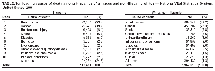 Persons using assistive technology might not be able to fully access information in this file. For assistance, please send e-mail to: mmwrq@cdc.gov. Type 508 Accommodation and the title of the report in the subject line of e-mail. Health Disparities Experienced by Hispanics --- United StatesIn the 2000 census, 35.3 million persons in the United States and 3.8 million persons in the Commonwealth of Puerto Rico identified themselves as Hispanic (i.e., Hispanic, Spanish, or Latino; of all races). Hispanics constituted 12.5% of the U.S. population in the 50 states; by subpopulation, they identified as Mexican (7.3%), Puerto Rican (1.2%), Cuban (0.4%), and other Hispanic (3.6%) (1). For certain health conditions, Hispanics bear a disproportionate burden of disease, injury, death, and disability when compared with non-Hispanic whites, the largest racial/ethnic population in the United States. The leading causes of death among Hispanics vary from those for non-Hispanic whites (Table). This week's MMWR is the second in a series focusing on racial/ethnic health disparities; eliminating these disparities will require culturally appropriate public health initiatives, community support, and equitable access to quality health care. In 2001, Hispanics of all races experienced more age-adjusted years of potential life lost before age 75 years per 100,000 population than non-Hispanic whites for the following causes of death: stroke (18% more), chronic liver disease and cirrhosis (62%), diabetes (41%), human immunodeficiency virus (HIV) disease (168%), and homicide (128%); in 2000, Hispanics had higher age-adjusted incidence for cancers of the cervix (152% higher) and stomach (63% higher for males and 150% higher for females) (2). During 1999--2000, Mexican Americans aged 20--74 years reported higher rates of overweight (11% higher for males and 26% higher for females) and obesity (7% higher for males and 32% higher for females) than non-Hispanic whites (3); Mexican-American youths aged 12--19 years also reported higher rates of overweight (112% higher for males and 59% higher for females) (3). Despite recent progress, ethnic disparities persist among the leading indicators of good health identified in the national health objectives for 2010 (4). Hispanics or Hispanic subpopulations trailed non-Hispanic whites in various measures*, including 1) persons aged <65 years with health insurance (66% Hispanics versus 87% non-Hispanic whites, 2002) and persons with a regular source of ongoing health care (77% versus 90%, 2002); 2) children aged 19--35 months who are fully vaccinated (73% versus 78%, 2002) and adults aged >65 years vaccinated against influenza (49% versus 69%, 2002) and pneumococcal disease (28% versus 60%, 2002) during the preceding 12 months; 3) women receiving prenatal care in the first trimester (77% versus 89%, 2002); 4) persons aged >18 years who participated in regular moderate physical activity (23% versus 35%, in 2002); 5) persons who died from homicide (8.2 versus 4.0 per 100,000 population, 2001); and 6) persons aged 6--19 years who were obese (24% [Mexican Americans] versus 12%, 1999--2000), and adults who were obese (34% [Mexican Americans] versus 29%, 1999--2000). In other health categories (e.g., tobacco use and exposure to secondhand smoke, infant mortality, and low birthweight), Hispanics led non-Hispanic whites. In addition, since the 1970s, ethnic disparities in measles-vaccine coverage during childhood and in endemic measles have been all but eliminated (5); however, during 1996--2001, the vaccination-coverage gap between non-Hispanic white and Hispanic children widened by an average of 0.5% each year for children aged 19--35 months who were up to date for the 4:3:1:3:3 series of vaccines recommended to prevent diphtheria, tetanus, and pertussis; polio; measles; Haemophilus influenzae type b disease; and hepatitis B (6). Reported by: Office of Minority Health, Office of the Director, CDC. Editorial Note:Socioeconomic factors (e.g., education, employment, and poverty), lifestyle behaviors (e.g., physical activity and alcohol intake), social environment (e.g., educational and economic opportunities, racial/ethnic discrimination, and neighborhood and work conditions), and access to preventive health-care services (e.g., cancer screening and vaccination) contribute to racial/ethnic health disparities (7). Level of education has been correlated with prevalence of certain health risks (e.g., obesity, lack of physical activity, and cigarette smoking) (8). Recent immigrants also can be at increased risk for chronic disease and injury, particularly those who lack fluency in English and familiarity with the U.S. health-care system or who have different cultural attitudes about the use of traditional versus conventional medicine. Since 1985, the U.S. Department of Health and Human Services (DHHS) has coordinated initiatives to reduce or eliminate racial/ethnic health disparities, including the Hispanic Agenda for Action, Educational Excellence for Hispanic Americans, Improving Access to Services for Persons with Limited English Proficiency, Hispanic Employment in the Federal Government, the Initiative to Eliminate Racial and Ethnic Disparities in Health, and Healthy People 2010. Information about these initiatives is available at http://www.cdc.gov/omh/aboutus/executive.htm. Ongoing public awareness campaigns include Closing the Health Gap and Take a Loved One to the Doctor Day. To promote consistency in measuring progress toward Healthy People 2010 objectives, a DHHS workgroup recently recommended standards and techniques for measuring progress toward eliminating health disparities (9). The workgroup recommended that 1) progress toward eliminating disparities for individual subpopulations be measured in terms of the percentage difference between each subpopulation rate and the most favorable or "best" subpopulation rate in each domain and 2) all measures be expressed in terms of adverse