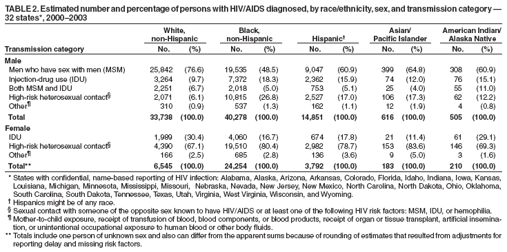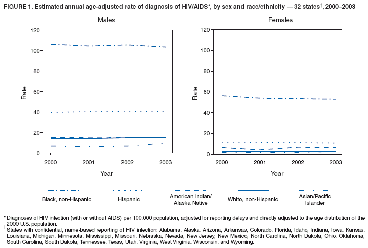 Persons using assistive technology might not be able to fully access information in this file. For assistance, please send e-mail to: mmwrq@cdc.gov. Type 508 Accommodation and the title of the report in the subject line of e-mail. Diagnoses of HIV/AIDS --- 32 States, 2000--2003An estimated 850,000--950,000 persons in the United States are living with human immunodeficiency virus (HIV), including 180,000--280,000 who do not know they are infected (1). To examine trends of diagnoses for 2000--2003, CDC analyzed HIV and acquired immunodeficiency syndrome (AIDS) together as HIV/AIDS (i.e., HIV infection with or without AIDS), counted by the year of earliest reported diagnosis of HIV infection. From 2000 to 2003, in 32 states* that used confidential, name-based reporting of HIV and AIDS cases for >4 years, the overall annual rate of diagnosis of HIV/AIDS remained stable. However, rates among non-Hispanic black females were 19 times higher than rates among non-Hispanic white females, underscoring the need for continued emphasis on programs targeting females in racial/ethnic minority populations to reduce the number of cases of HIV/AIDS. CDC surveillance reports of HIV/AIDS are limited to cases among residents of states and U.S. territories where surveillance for non-AIDS HIV infection is conducted by using the same confidential, name-based reporting approach as for AIDS case reporting (2). The number of states conducting HIV/AIDS surveillance in this manner has gradually increased, resulting in available data for a greater proportion of cases in the United States. Numbers of cases, age-adjusted rates, and associated confidence intervals (CIs) were calculated, adjusting for random variation, reporting delay, and missing information on HIV risk factors (e.g., men who have sex with men [MSM] and injection-drug use [IDU]) (3,4). Data from territories were not included in this analysis. Cases were classified in the following hierarchy of transmission categories: MSM, IDU, both MSM and IDU, high-risk heterosexual contact (i.e., with someone of the opposite sex known to have HIV/AIDS or a risk factor [e.g., MSM or IDU] for HIV/AIDS), and all other HIV risk factors combined. Age-adjusted rates were calculated by the direct method, using the age distribution of the 2000 U.S. population as the standard. The statistical significance of differences between a pair of rates was assessed by the z test. To estimate the annual proportional change in a rate or number of diagnoses during 2000--2003, the logarithm of the rate or number was fit to a linear model. The significance of a trend was assessed by determining whether the 95% CI for the estimated annual proportional change included zero. During 2000--2003, HIV/AIDS was diagnosed in 125,800 persons who resided in the 32 states. Of these persons, 35,241 (28.0%) were female (Table 1). Although non-Hispanic blacks constituted 13% of the population of the 32 states during these 4 years (5), they accounted for more than half (64,532 [51.3%]) of the HIV/AIDS diagnoses, including 68.8% of diagnoses among females and 44.5% of those among males. The remaining cases were among non-Hispanic whites (40,284 [32.0%]), Hispanics (18,642 [14.8%]), Asians/Pacific Islanders (799 [0.6%]), and American Indians/Alaska Natives (715 [0.6%]). Non-Hispanic blacks constituted 35.2% of cases in the MSM transmission category, 56.9% of cases in the IDU transmission category, 70.4% of cases in the high-risk heterosexual contact category, and 69.8% of cases of mother-to-child transmission. The transmission category with the largest proportion of males with HIV/AIDS was MSM (61.2%), followed by high-risk heterosexual contact (17.3%), and IDU (14.6%) (Table 1). The transmission category with the largest proportion of females with HIV/AIDS was high-risk heterosexual contact (77.7%), followed by IDU (19.4%). The proportional distribution of cases by transmission category varied by race/ethnicity (Table 2). During 2000--2003, annual age-adjusted rates of HIV/AIDS diagnosis per 100,000 population changed little (Figure 1). Overall, the rate increased 1.0%, from 19.5 in 2000 to 19.7 in 2003. Further analyses indicated statistically significant (p<0.05) changes among certain populations. The rate among males increased 3.0% (from 27.9 to 28.8), and the rate among females decreased 3.7% (from 11.2 to 10.8). The rate among non-Hispanic white males increased 6.2% (from 14.3 to 15.2), and the rate among Asian/Pacific Islander males increased 39.7% (from 7.0 to 9.8); the rate among non-Hispanic black females decreased 6.0% (from 56.4 to 53.0). Trends in annual age-adjusted rates among other sex and racial/ethnic groups were not significant. Rates among non-Hispanic black females were 19 times the rate among non-Hispanic white females, five times the rate among Hispanic females, and also higher than rates among males in any racial/ethnic population other than non-Hispanic blacks. Rates among non-Hispanic black males were seven times higher than those among non-Hispanic white males and three times higher than those among Hispanic males. Statistically significant trends in the annual number of diagnoses included a 4.9% increase, from 2000 to 2003, among males (from 22,117 to 23,203). A 2.1% decrease among females (from 8,986 to 8,791) was not statistically significant. The increasing rate and number of diagnoses among males largely reflected the upward trend in the number of diagnoses associated with MSM, which increased 10.8% (Figure 2) from 13,099 to 14,510, consistent with the trend previously reported (6). The number of diagnoses associated with the combination of MSM and IDU decreased 10.3% (from 1,363 to 1,223). Reported by: RM Selik, MD, MK Glynn, DVM, MT McKenna, MD, Div of HIV/AIDS Prevention, National Center for HIV, STD, and TB Prevention, CDC. Editorial Note:The analysis of surveillance data for 2000--2003 reveals overall stable annual rates of HIV/AIDS diagnosis; these rates reflect the inte