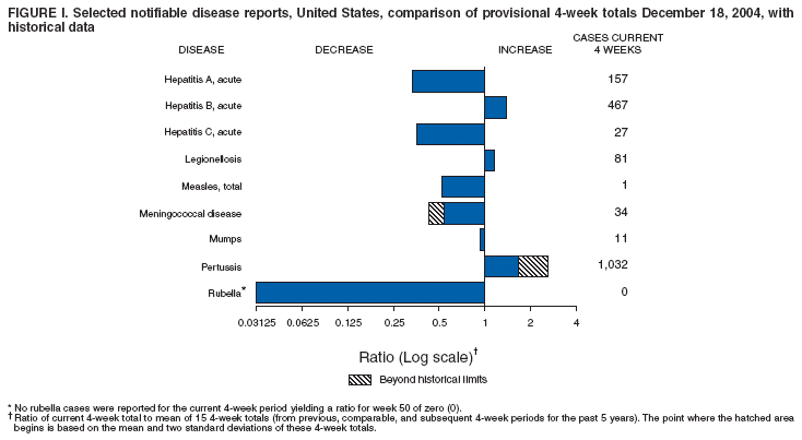 Persons using assistive technology might not be able to fully access information in this file. For assistance, please send e-mail to: mmwrq@cdc.gov. Type 508 Accommodation and the title of the report in the subject line of e-mail. Notifiable Diseases/Deaths in Selected Cities Weekly InformationFigure I Selected notifiable disease reports, United States, comparison of provisional 4-week totals ending December 18, 2004, with historical data Table I Summary of provisional cases of selected notifiable diseases, United States, cumulative, week ending December 18, 2004 (50th Week) Table II Provisional cases of selected notifiable diseases, United States, weeks ending December 18, 2004 and December 13, 2003 (50th Week) Table III Deaths in 122 U.S. cities, week ending December 18, 2004 (50th Week) Figure I ![]() Return to top. Table I ![]() Return to top. Table II