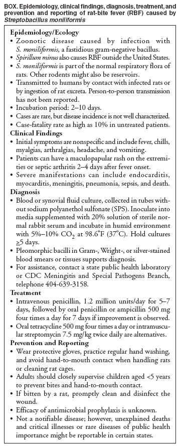 Persons using assistive technology might not be able to fully access information in this file. For assistance, please send e-mail to: mmwrq@cdc.gov. Type 508 Accommodation and the title of the report in the subject line of e-mail. Fatal Rat-Bite Fever --- Florida and Washington, 2003Rat-bite fever (RBF) is a rare, systemic illness caused by infection with Streptobacillus moniliformis. RBF has a case-fatality rate of 7%--10% among untreated patients (1). S. moniliformis is commonly found in the nasal and oropharyngeal flora of rats. Human infection can result from a bite or scratch from an infected or colonized rat, handling of an infected rat, or ingestion of food or water contaminated with infected rat excreta (1). An abrupt onset of fever, myalgias, arthralgias, vomiting, and headache typically occurs within 2--10 days of exposure and is usually followed by a maculopapular rash on the extremities (1). This report summarizes the clinical course and exposure history of two rapidly fatal cases of RBF identified by the CDC Unexplained Deaths and Critical Illnesses (UNEX) Project in 2003. These cases underscore the importance of 1) including RBF in the differential diagnoses of acutely ill patients with reported rat exposures and 2) preventing zoonotic infections among persons with occupational or recreational exposure to rats. Case ReportsFlorida. In early September 2003, a previously healthy woman aged 52 years visited an emergency department (ED) with a 2-day history of headache, abdominal pain, diarrhea, lethargy, right axillary lymphadenopathy, progressive myalgias, and pain in her distal extremities. On physical examination, she was afebrile and hypotensive (blood pressure: 82/40 mmHg) with left-sided abdominal tenderness and scleral icterus; no rash was noted. Laboratory tests indicated a mildly elevated white blood cell count of 13,800 cells/µL (normal: 5,000--10,000 cells/µL), thrombocytopenia (71,000 platelets/µL [normal: 130,000--500,000 platelets/µL]), elevated alanine aminotransferase of 112 U/L (normal: 20--52 U/L), elevated aspartate aminotransferase of 154 U/L (normal: <40 U/L), elevated total bilirubin of 5.8 mg/dL (normal: 0.2--1.2 mg/dL), elevated blood urea nitrogen of 55 mg/dL (normal: 7--23 mg/dL), and elevated creatinine of 2.9 mg/dL (normal: 0.7--1.5 mg/dL). The patient was admitted to the intensive care unit, where she became increasingly hypoxic with marked anemia (hemoglobin: 8.6 g/dL [normal: 12--16 g/dL]) and increasingly severe thrombocytopenia (32,000 platelets/µL). She was treated with ciprofloxacin, metronidazole, and vancomycin for possible gram-negative sepsis and received two blood transfusions; however, she died approximately 12 hours after admission. A maculopapular rash was noted postmortem. No autopsy was performed. Peripheral blood smears obtained before death revealed abundant neutrophils and intracellular collections of filamentous bacteria (Figure). Premortem blood from a tube containing no additives or separators was inoculated onto a blood agar plate and incubated in CO2 at 95ºF (35ºC). After 72 hours, the culture demonstrated slight growth of gram-negative filamentous bacteria. UNEX was contacted for assistance, and diagnostic specimens were submitted to CDC for further laboratory evaluation. At CDC, the isolate was subcultured onto media enriched with 20% solution of sterile normal rabbit serum and incubated in a candle jar for 48 hours. Biochemical analyses identified the bacterial isolate as S. moniliformis. The 16S rRNA gene sequences amplified from DNA extracted from the patient's blood and the bacterial isolate were consistent with S. moniliformis. The patient had been employed at a pet store. She was bitten on her right index finger by a rat in the store 2 days before symptom onset and 4 days before arriving at the ED. She self-treated the wound by using antiseptic ointment immediately after being bitten. In addition, she had regular contact with several pet rats, cats, a dog, and an iguana at her home; however, no bites from these animals were reported. None of the animals were tested for S. moniliformis. Washington. In late November 2003, a previously healthy woman aged 19 years was pronounced dead on arrival at a hospital ED. No laboratory studies were performed in the ED. An acquaintance reported that the patient had experienced a 3-day history of fever, headache, myalgias, nausea, and profound weakness without cough, vomiting, diarrhea, or rash. Before her transport to the ED, she exhibited anxiety, confusion, and labored breathing. ED staff noted that she appeared jaundiced. The body was transported to the coroner's office, where an autopsy was performed. Cultures of blood and tissue from autopsy were negative for pathogenic organisms. A toxicology screen was negative. Serologic assays for leptospirosis, Epstein-Barr virus, cytomegalovirus, and viral hepatitis were negative for recent infection. Histopathology revealed findings suggestive of a systemic infectious process that included disseminated intravascular coagulopathy and inflammatory cell infiltrates in the liver, heart, and lungs. UNEX was contacted for assistance, and project staff facilitated the submission of diagnostic specimens to CDC for further laboratory evaluation. Immunohistochemical assays performed at CDC for Leptospira spp., Bartonella quintana, spotted fever and typhus group rickettsiae, flaviviruses, hantaviruses, and influenza viruses were negative. Clusters of filamentous bacteria were identified in sections of the liver and kidney by using a silver stain. The 16S rRNA gene sequence amplified from DNA extracted from paraffin-embedded, formalin-fixed samples of liver and kidney was consistent with S. moniliformis. The patient worked as a dog groomer and lived in an apartment with nine pet rats. One pet rat with respiratory symptoms had recently been prescribed oral doxycycline after having been evaluated at a veterinary clinic. Doxycycline was subsequ
