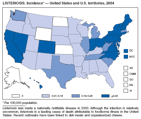 Population estimates for the states are derived from NCHS estimates of the July 1, 2000--July 1, 2003, U.S. resident population from the Vintage 2003 postcensal series by year, county, age, sex, race, and Hispanic origin, prepared under a collaborative arrangement with the U.S. Census Bureau (available at http://www.cdc.gov/nchs/about/major/dvs/popbridge/popbridge.htm). Population numbers for territories are 2003 estimates from the U.S. Census Bureau International Data Base Data Access--Display Mode (available at http://www.census.gov/main/ipc/www/idbprint.html). The choice of population denominators for incidence reported in the MMWR is based on 1) the availability of census population data at the time of preparation for publication and 2) the desire for consistent use of the same population data to compute incidence reported by different CDC programs. Incidence in the Summary is calculated as the number of reported cases for each disease or condition divided by either the U.S. resident population for the specified demographic population or the total U.S. residential population, multiplied by 100,000. When a nationally notifiable disease is associated with a specific age restriction, the same age restriction is applied to the population in the denominator of the incidence calculation. In addition, population data from states in which the disease or condition was not notifiable or was not available were excluded from incidence calculations. Unless otherwise stated, disease totals for the United States do not include data for American Samoa, Guam, Puerto Rico, the U.S. Virgin Islands, or the Commonwealth of the Northern Mariana Islands.