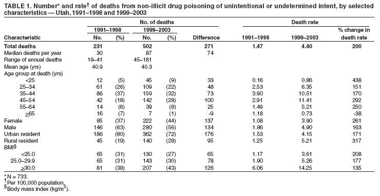 The findings in this report indicate that deaths attributed to drug poisoning have increased in Utah for more than a decade; however, the characteristics of these deaths have changed since 1999, when deaths caused by non-illicit drugs began to increase substantially. In 2003, the typical drug-poisoning decedent in Utah was overweight or obese, aged 25--54 years, had died from the effects of non-illicit drugs, and was less likely than previously to be male and to live in an urban area.
