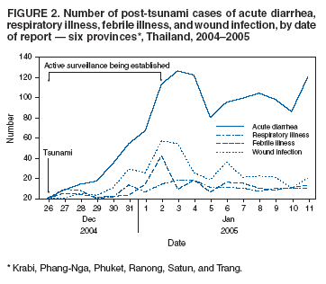 Persons using assistive technology might not be able to fully access information in this file. For assistance, please send e-mail to: mmwrq@cdc.gov. Type 508 Accommodation and the title of the report in the subject line of e-mail. Rapid Health Response, Assessment, and Surveillance After a Tsunami --- Thailand, 2004--2005On December 26, 2004, an earthquake triggered a devastating tsunami that caused an estimated 225,000 deaths in eight countries (India, Indonesia, Malaysia, Maldives, Seychelles, Somalia, Sri Lanka, and Thailand) on two continents. In Thailand, six provinces (Krabi, Phang-Nga, Phuket, Ranong, Satun, and Trang) were impacted (Figure 1), including prominent international tourist destinations. The Thai Ministry of Public Health (MOPH) responded with rapid mobilization of local and nonlocal clinicians, public health practitioners, and medical supplies; assessment of health-care needs; identification of the dead, injured, and missing; and active surveillance of syndromic illness. The MOPH response was augmented by technical assistance from the Thai MOPH--U.S. CDC Collaboration (TUC) and the Armed Forces Research Institute of Medical Sciences (AFRIMS), with support from the office of the World Health Organization (WHO) representative to Thailand. This report summarizes these activities. The experiences in Thailand underscore the value of written and rehearsed disaster plans, capacity for rapid mobilization, local coordination of relief activities, and active public health surveillance. Rapid ResponseMOPH rapidly activated mass casualty plans and deployed personnel and resources to meet local health-care needs. On December 26, a central command center in Bangkok and command centers in each of the six impacted provinces were established to coordinate activities. Deployments included approximately 100 teams providing emergency clinical care, 12 teams providing technical support and health education, five teams conducting active surveillance and investigating potential outbreaks, six teams providing mental health support, and three teams of MOPH-accredited massage therapists providing traditional Thai massage therapy for relief workers and displaced persons. The first team from Bangkok arrived on December 26, approximately 6 hours after the tsunami struck. As of January 9, an estimated 90,000 persons in affected communities, relief centers, and displaced-person camps had received medical and mental health care; 9,798 received outpatient services, 2,233 received inpatient services (398 were in intensive care, and 1,254 underwent major surgical procedures), and approximately 80,000 persons received other types of care from mobile teams. Outbreak risks and sanitation, environmental, and community mental health needs were rapidly assessed and addressed. Health education programs on personal hygiene, water and food safety, garbage disposal, toilet construction, injury prevention, and mental health were initiated. Laboratories used for disease surveillance were supplemented with additional staff and equipment; food, drinking water, and sea water were assessed for safety. Health and Needs AssessmentDuring December 30, 2004--January 6, 2005, three teams of Thai and U.S. health professionals from TUC and AFRIMS conducted a rapid health and needs assessment in the impacted provinces. Logistic and strategic support was provided by the Joint U.S.-Thai Military Advisory Group, Thailand. Using a WHO rapid assessment tool (1), investigators collected data on hospital characteristics; damage to buildings and communication, electricity, water, and sewage systems; adequacy and condition of health-care personnel, medical supplies, and morgue facilities; and anticipated medical needs. Questions were initially directed to provincial health office staff members. However, on the provincial staffs' recommendation, staff from 10 mainland hospitals (four in Phuket, two in Phang-Nga, and one each in Krabi, Ranong, Satun, and Trang) and leaders from approximately 12 coastal and island communities in the six impacted provinces also were interviewed. The 10 hospitals, with approximately 2,000 inpatient beds and 24 operating rooms, served as the primary referral centers for tsunami-related medical care. None of the 10 hospitals had been damaged by the tsunami; all had activated previously rehearsed, written mass casualty plans. Shortages of blood, blood products, and certain medical supplies (e.g., surgical devices and antibiotics) were noted during the first 2 days after the tsunami. Hospital morgue facilities were inadequate for the number of dead, and corpses were moved from hospitals to temporary morgues at nearby wats (temples). Rapid mobilization of health professionals from multiple areas in Thailand resulted in adequate numbers of staff. By December 30, hospital patient loads were returning to usual levels, and the supplementary medical staff were released. By January 4, provincial health officials reported that needs for staff and supplies were being met. However, coordination of relief efforts was a challenge. One province was required to coordinate the concurrent activities and service areas of 14 health teams from volunteer organizations. A small hospital on the island of Koh Phi Phi in Krabi Province was destroyed by the tsunami, and four health clinics in coastal villages and islands were severely damaged or destroyed. Temporary clinics were established by provincial medical staff and volunteer organizations in some coastal villages and in displaced-person shelters. In the hospitals and communities assessed, food and bottled water were plentiful, and written guidance on water decontamination was posted. Public Health SurveillanceAs of January 25, in the six impacted provinces, 5,388 deaths had been confirmed; 8,457 persons were reported injured, and 3,120 persons remained missing (2). Phang-Nga Province was most severely affected, with 4,217 (78%) deaths, 5,597 (66%) persons injured, and 1,813 (58%